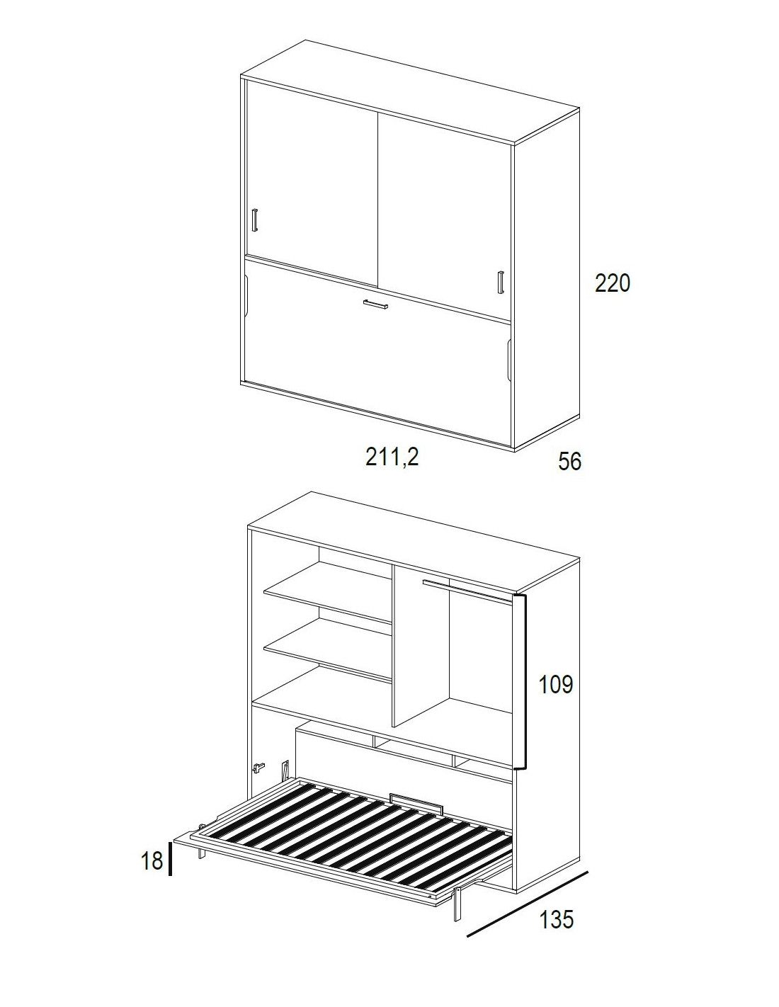 - Fondo: 56 cerrada y 135 / 150 abierta (para colchones de ancho 90 / 105 cm.)