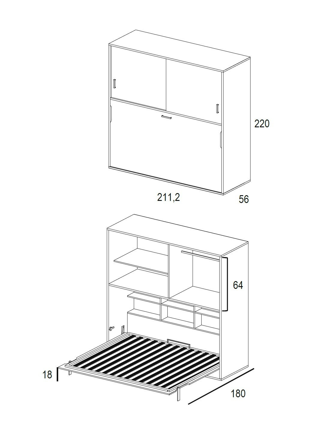 Esta cama abatible horizontal doble con armario corredera H220 está disponible para colchones de 135x190 cm. y 27 cm. de altura Tiene siguientes medidas totales en largo x alto x fondo (en cm.):