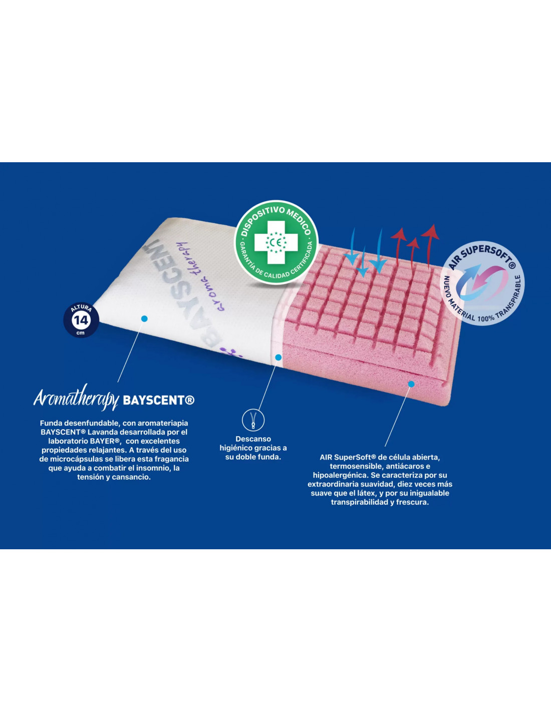 Funda desenfundable, con aromaterapia BAYSCENT® Lavanda desarrollada por el laboratorio BAYER®, con excelentes propiedades relajantes. A través del uso de microcápsulas se libera esta fragancia que ayuda a combatir el insomnio, la tensión y cansancio.