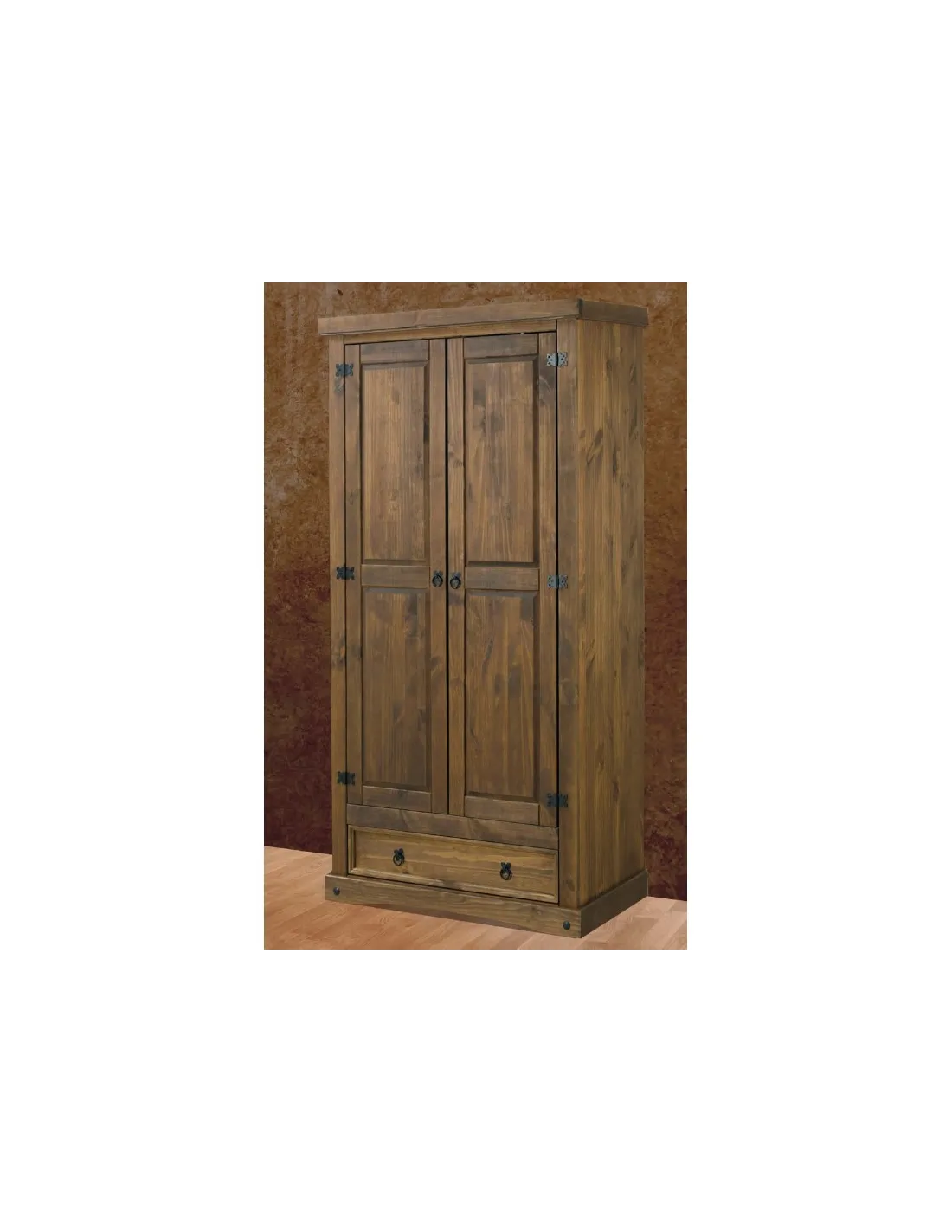 Este armario colonial de madera tiene un diseño inspirado en los muebles de estilo rústico. Fabricado en madera maciza de pino con acabado a la cera de color oscuro. Combinada con herrajes y tiradores de forja negra.