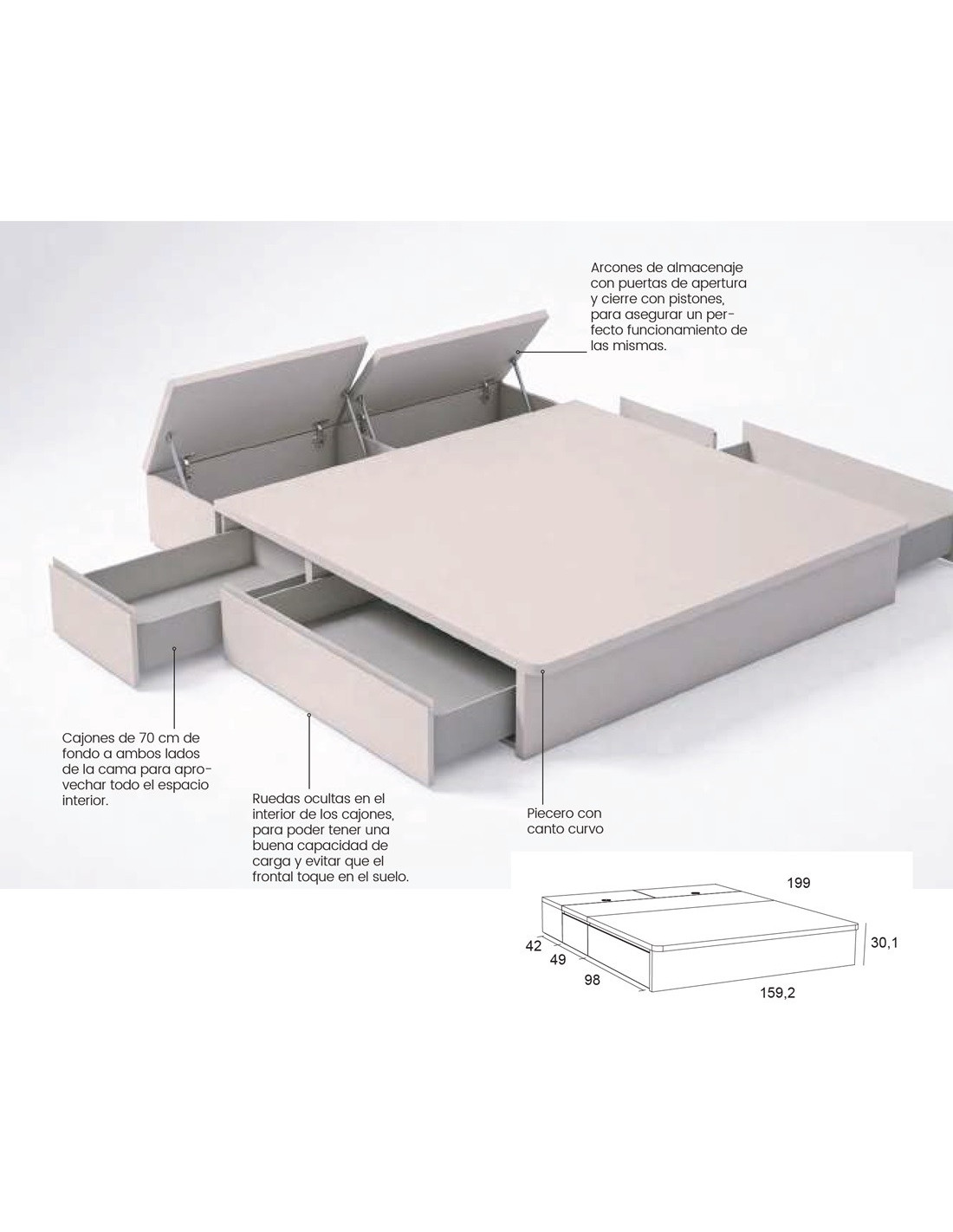 - Cama Tatami con cajones y arcones abatibles: para cama de 150, con un largo total de 159,2 cm. fondo de 199 cm. (para colchón de 190 cm. de largo) y altura 30,1 cm.