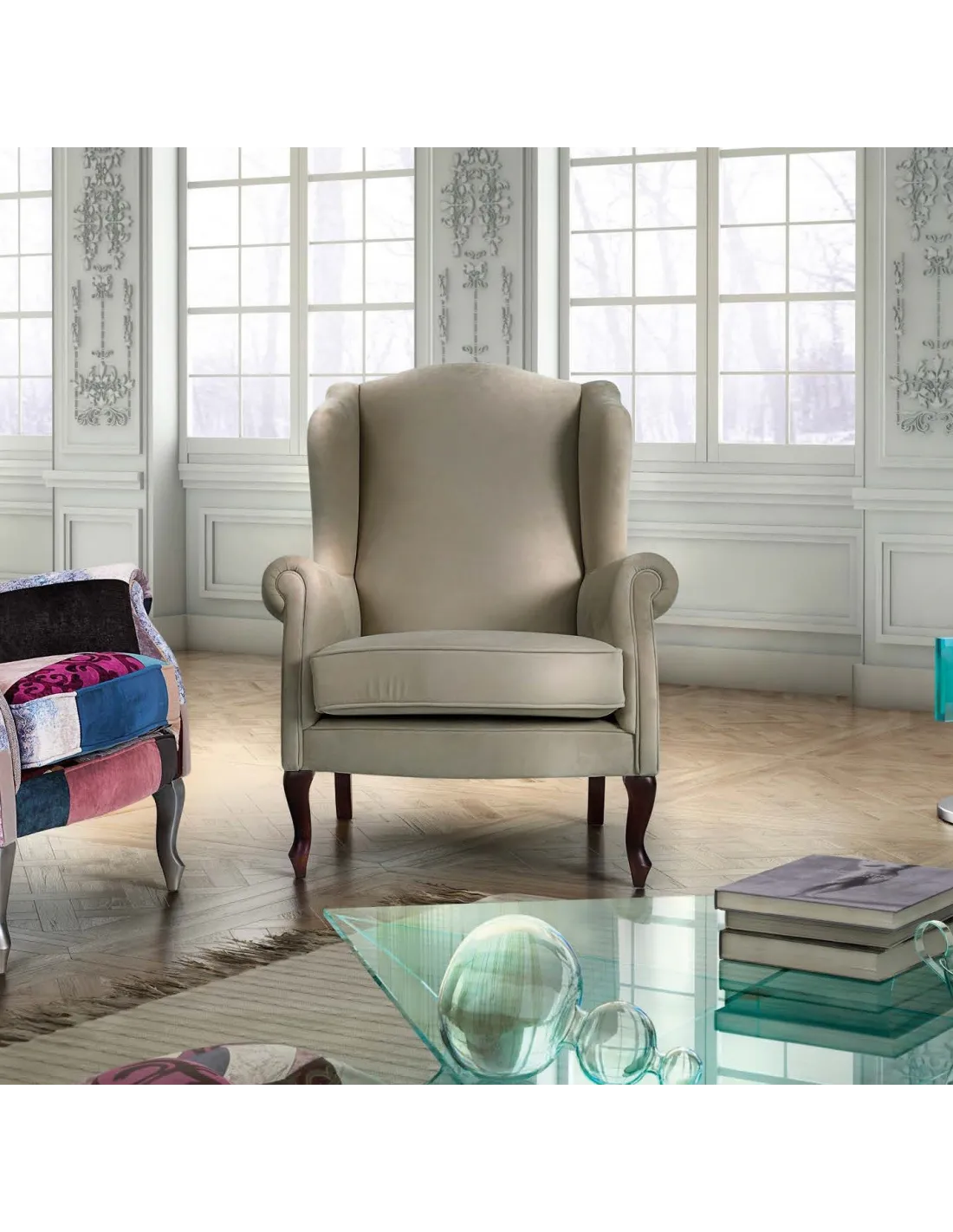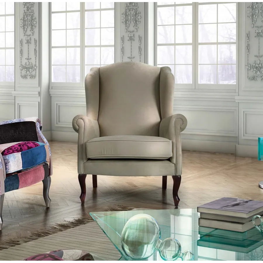 Butaca de diseño neoclásico de primera calidad donde se aúna la tradición, equilibrio y la comodidad. En este producto predominan las lineas encaminadas a la sencillez del diseño, con formas grandes y suaves crean la línea de un producto de encanto romántico y funcional, siendo un modelo totalmente personalizable.