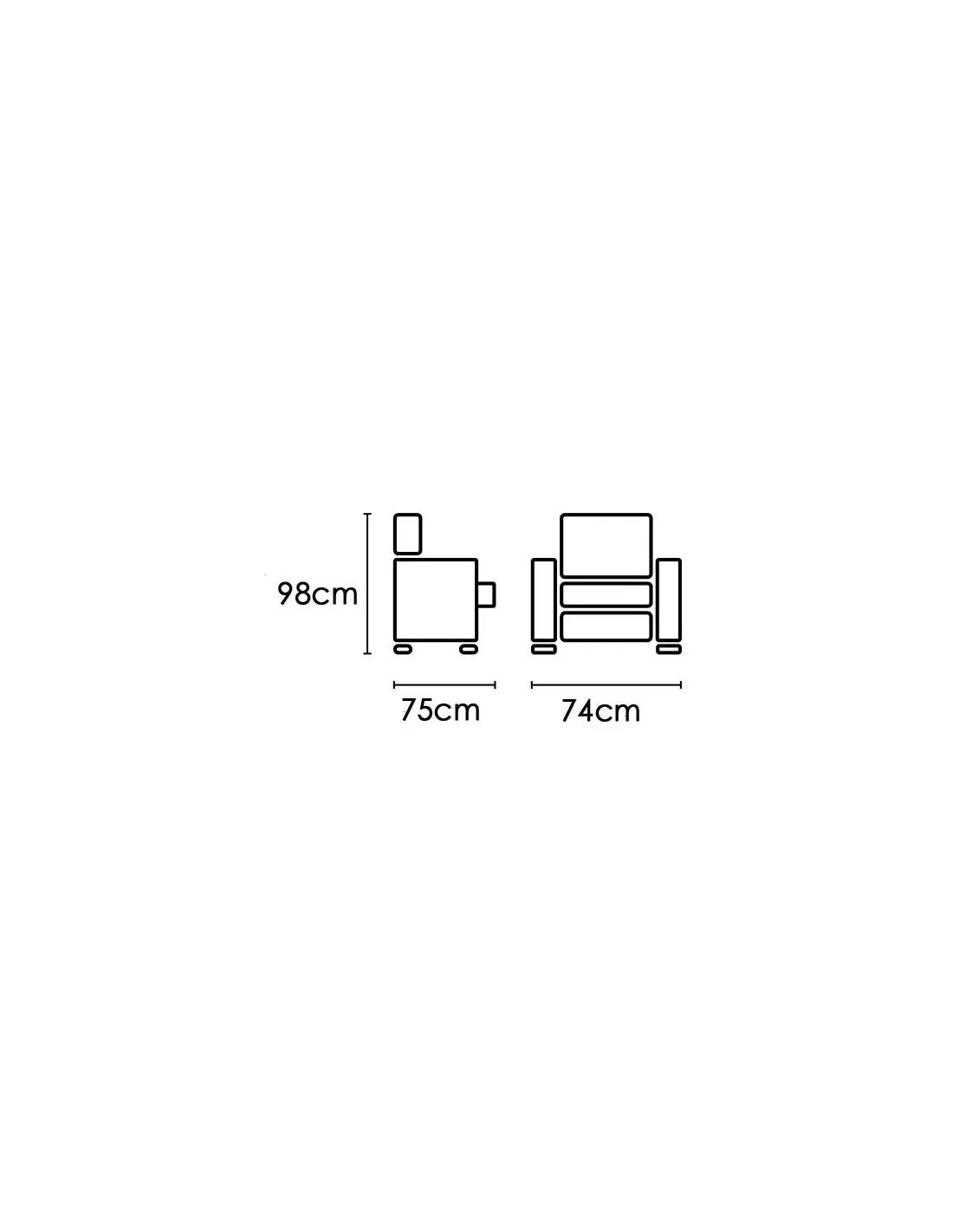 Este sillón tiene unas MEDIDAS totales de 74cm. de ancho, con fondo de 75 cm. y altura de 98cm.