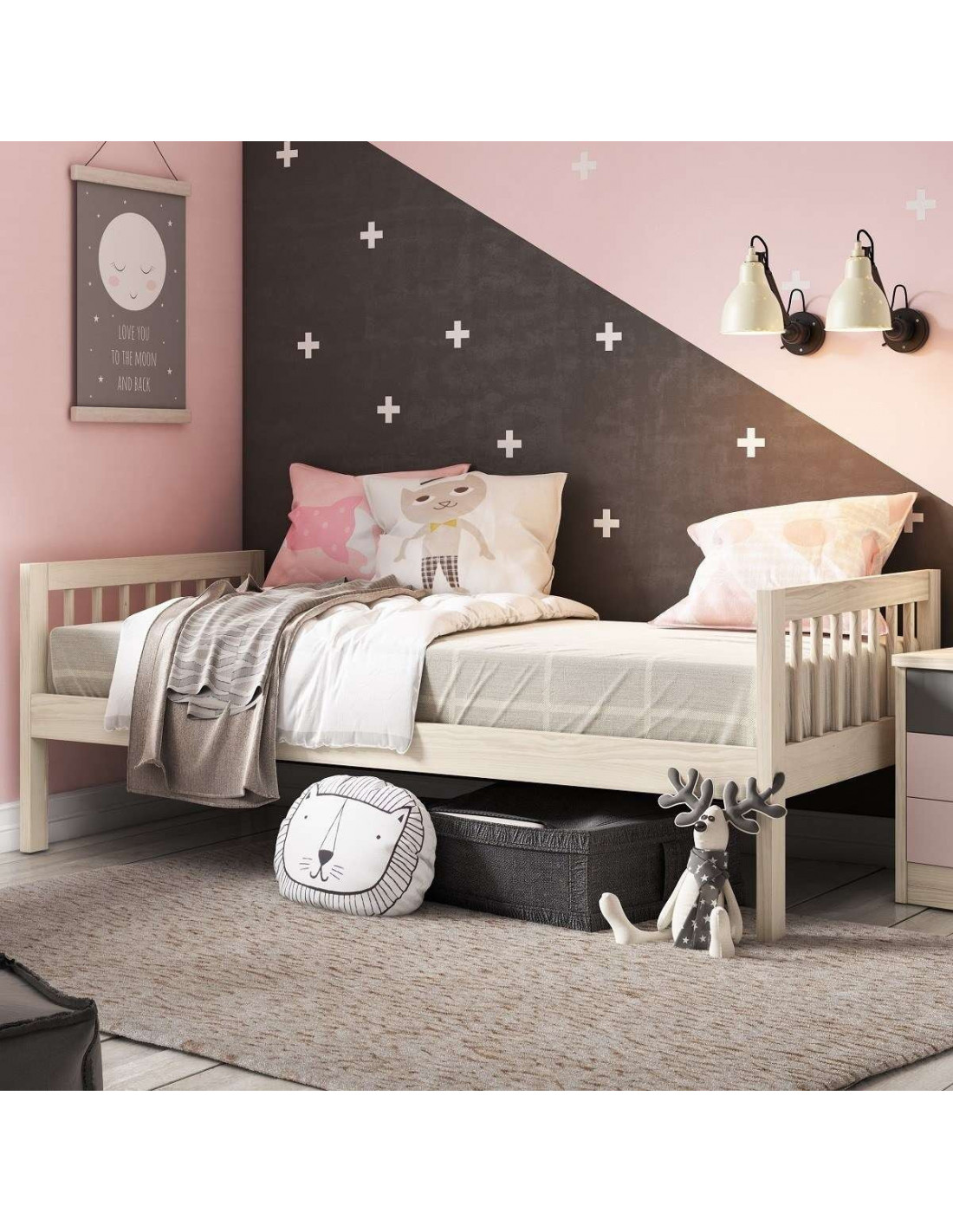 Se compone de cabecero, piecero, largueros y somier, todo ello fabricado en madera de pino maciza. Estas camas incluyen el somier de lamas de madera.