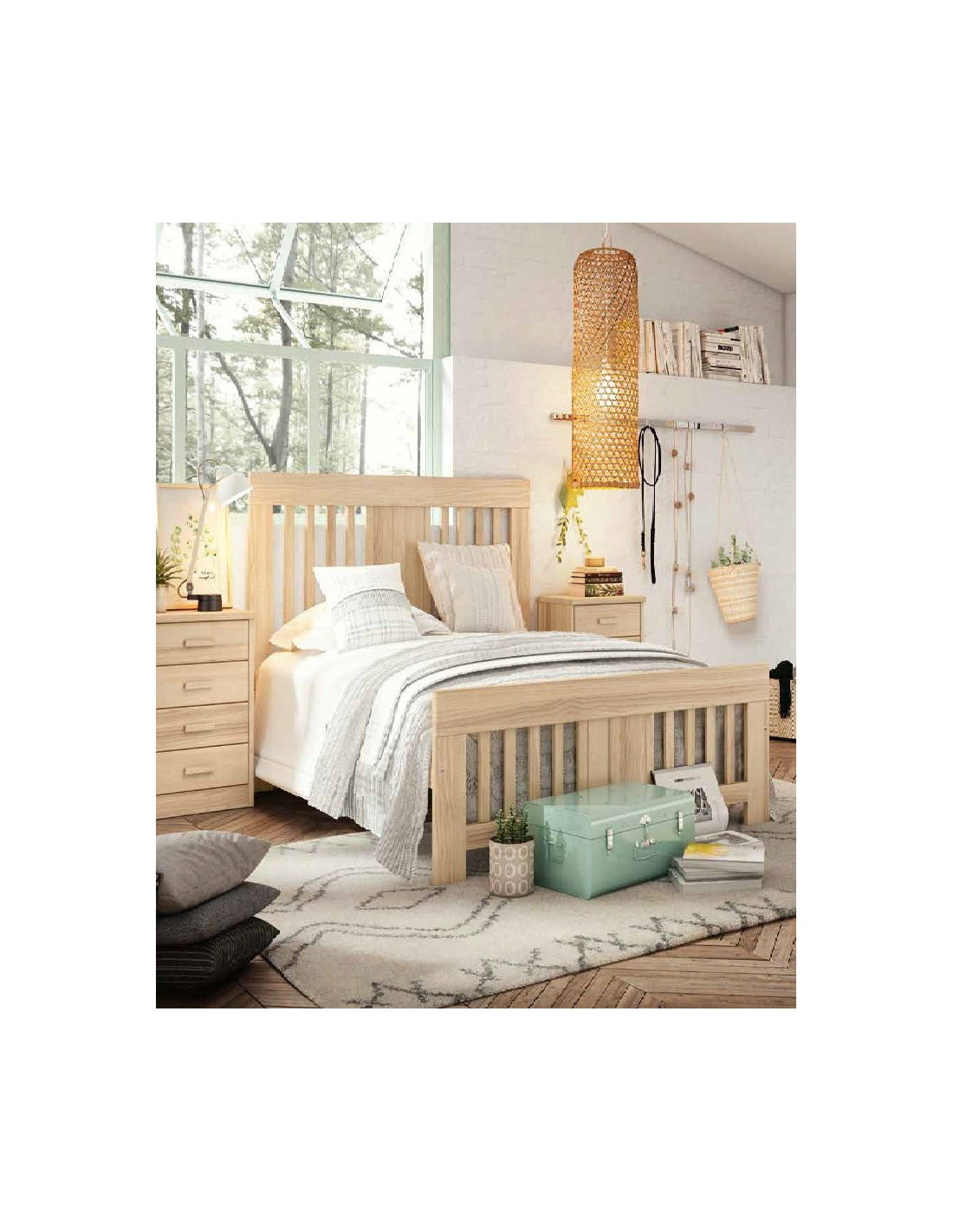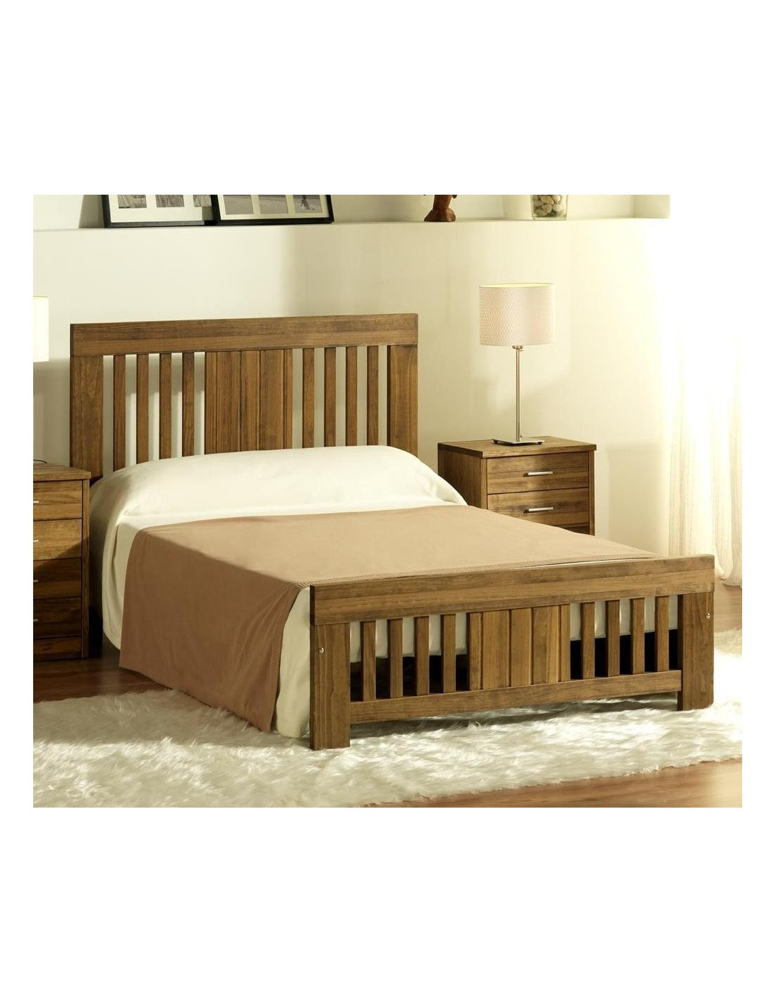 Esta cama de madera se compone del cabecero y piecero unidos mediante largueros de madera sobre los que se asientan el somier de lamas de madera (incluido). Tiene las siguientes medidas: