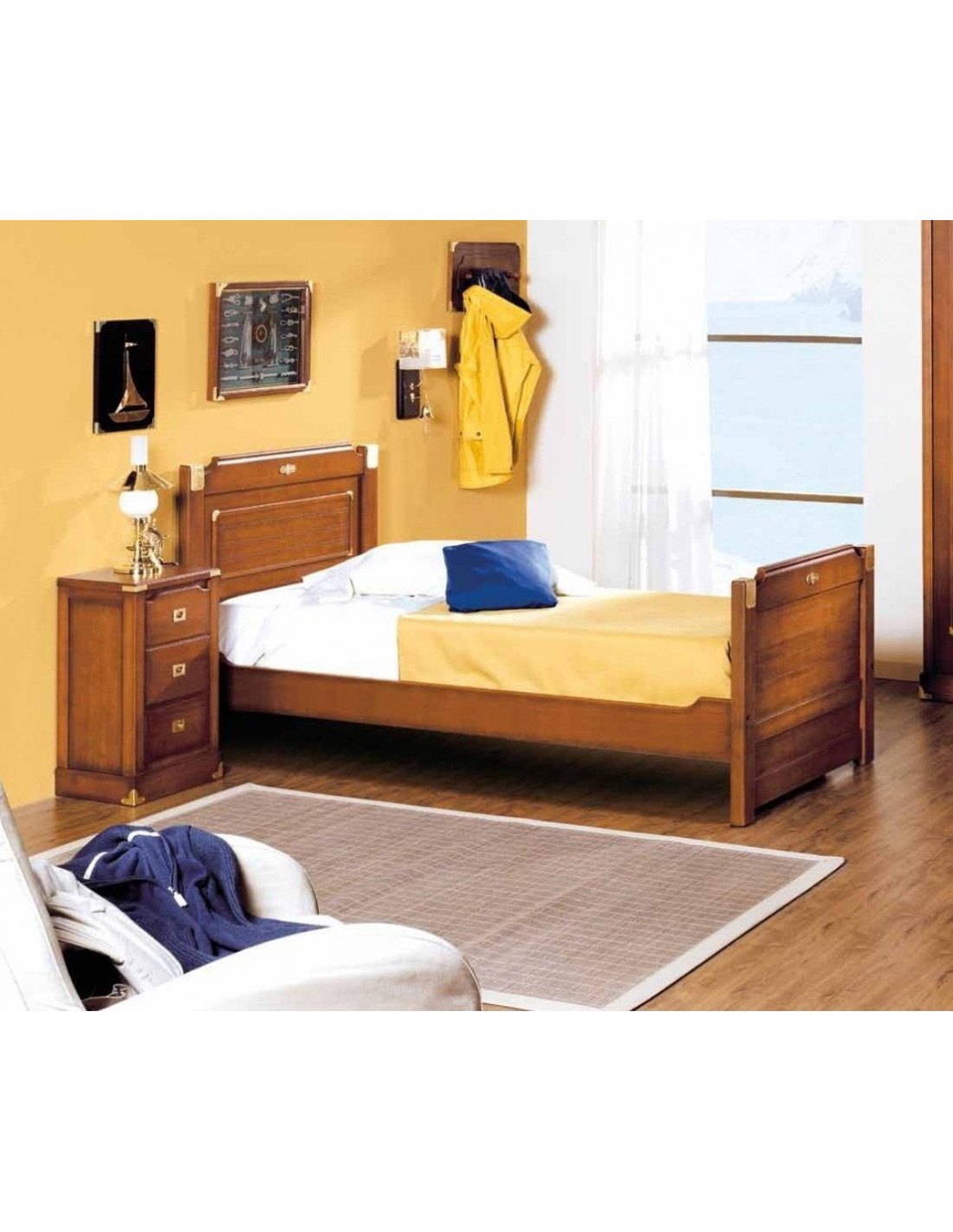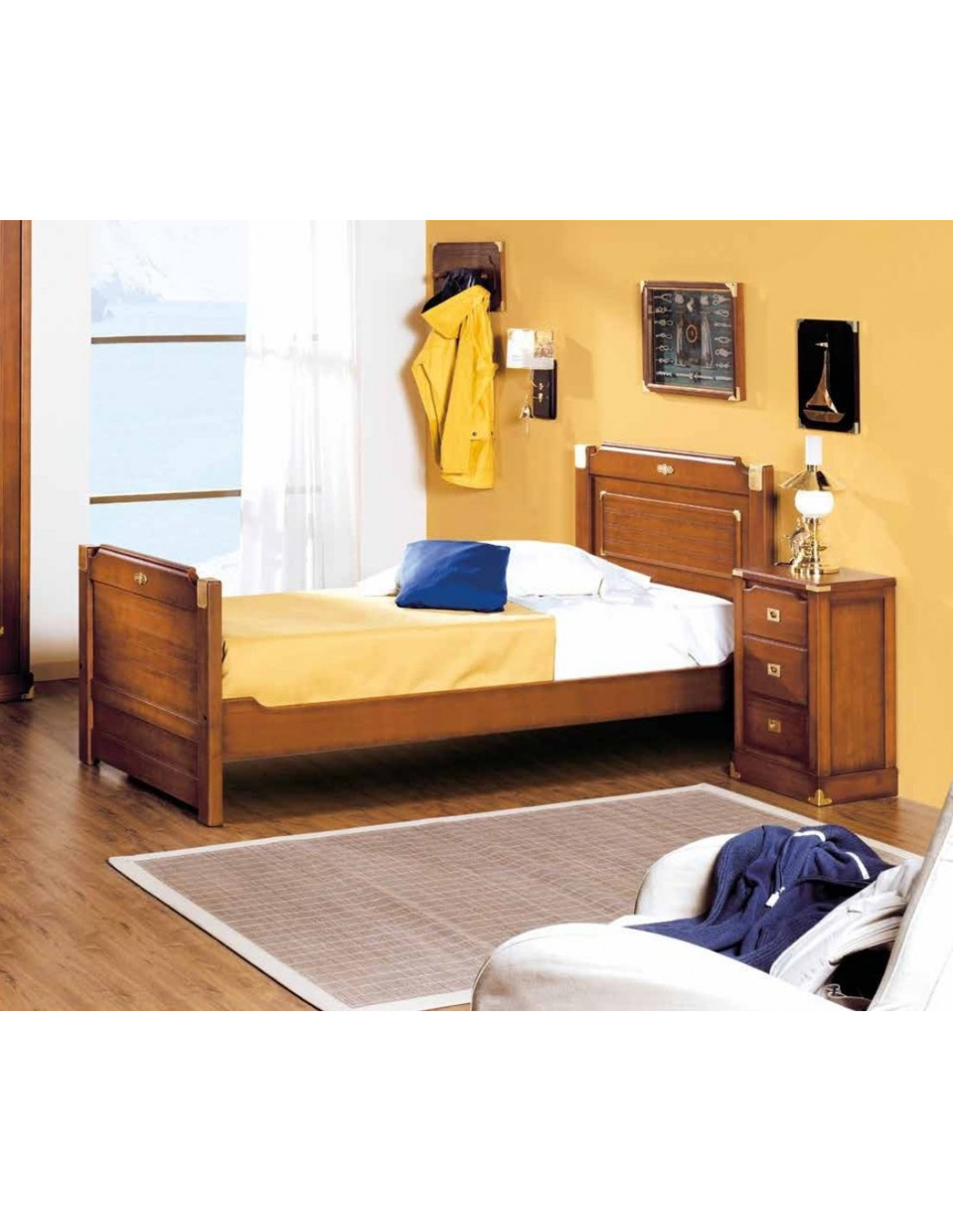 Esta cama juvenil de diseño clásico tiene unos acabados pulimentados y barnizados de primera calidad, con la posibilidad de elegir entre blanco decapado, nogal claro y nogal naútico, con los detalles del mueble y herrajes de latón pulido.