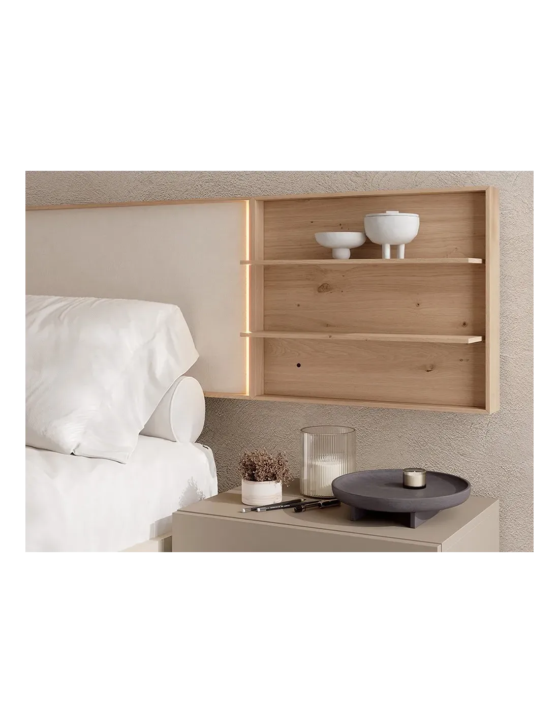 Este cabecero Persia de Tegar Mobel incluye dos piezas de diferentes tamaños de largo que se unen entre si para dar lugar a diferentes medidas de cabecero que, combinado con las mesitas del mismo fabricante, genera ambientes con cabezales de galería que toman de lado a lado de la composición.