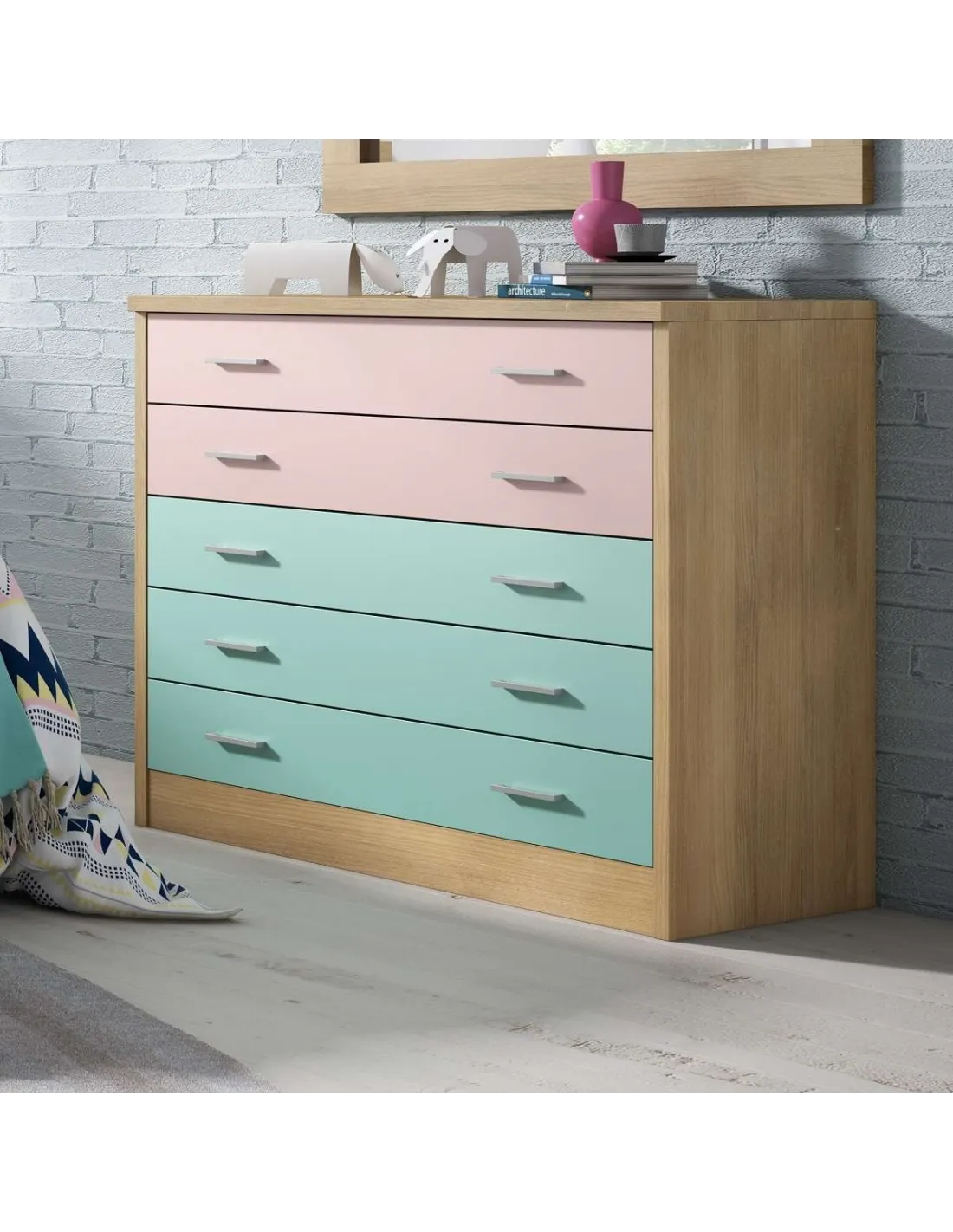Esta cómoda Nova 5C se puede personalizar en base a cuatro series de colores con terminaciones barnizadas, lacadas, decapés y glaseados.