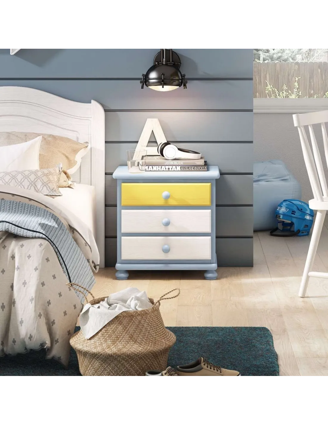 Esta mesita de noche Provenza 3C se puede personalizar en base a cuatro series de colores con terminaciones barnizadas, lacadas, decapés y glaseados.
