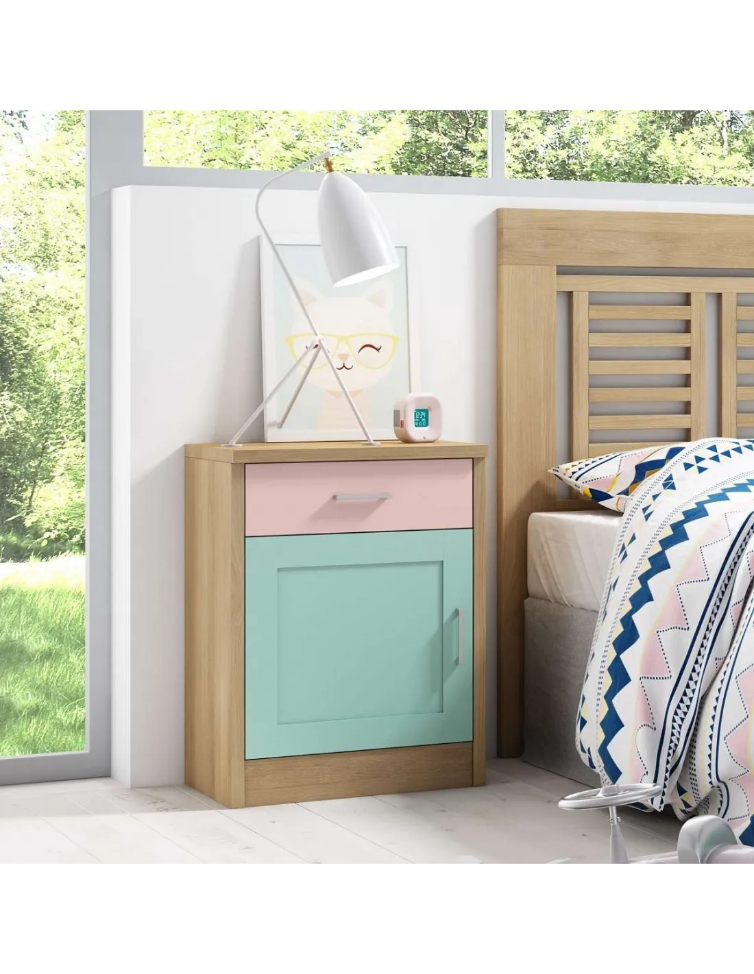 Mesita moderna madera 1C 1P en madera natural de pino