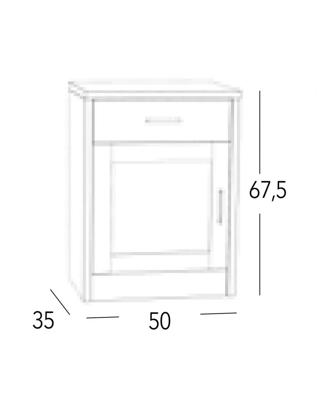 Esta mesita de noche madera 1C 1P está disponible con un cajón de guía metálica de deslizamiento suave y una puerta, con gran capacidad de almacenaje y las siguientes medidas totales en cm.: