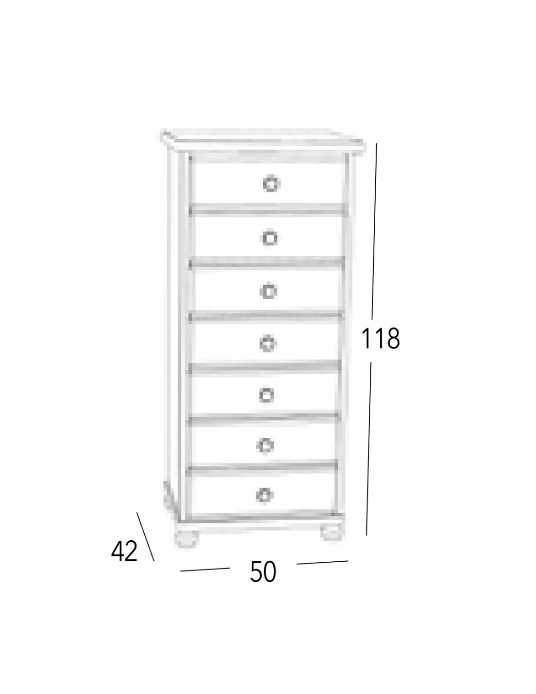 El Sinfonier Provenza 7C está disponible con siete cajones de guía de madera con capacidad de almacenaje, y presenta las siguientes medidas totales en cm.: