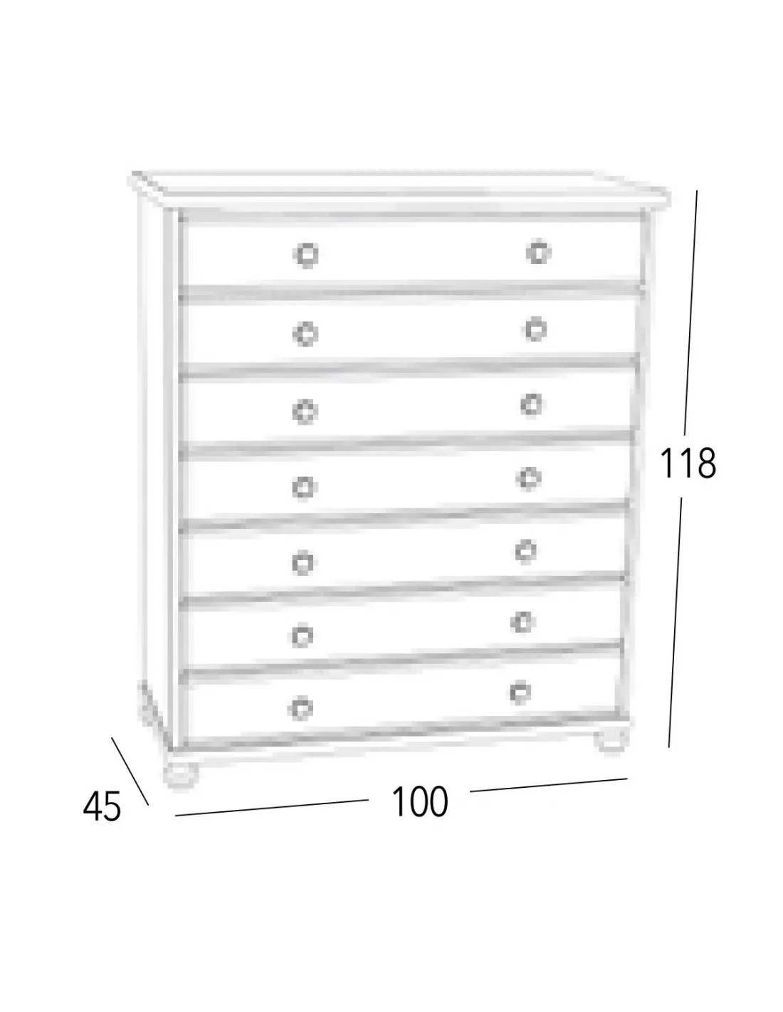 El Sinfonier Provenza 7C está disponible con siete cajones de guía de madera con capacidad de almacenaje, y presenta las siguientes medidas totales en cm.: