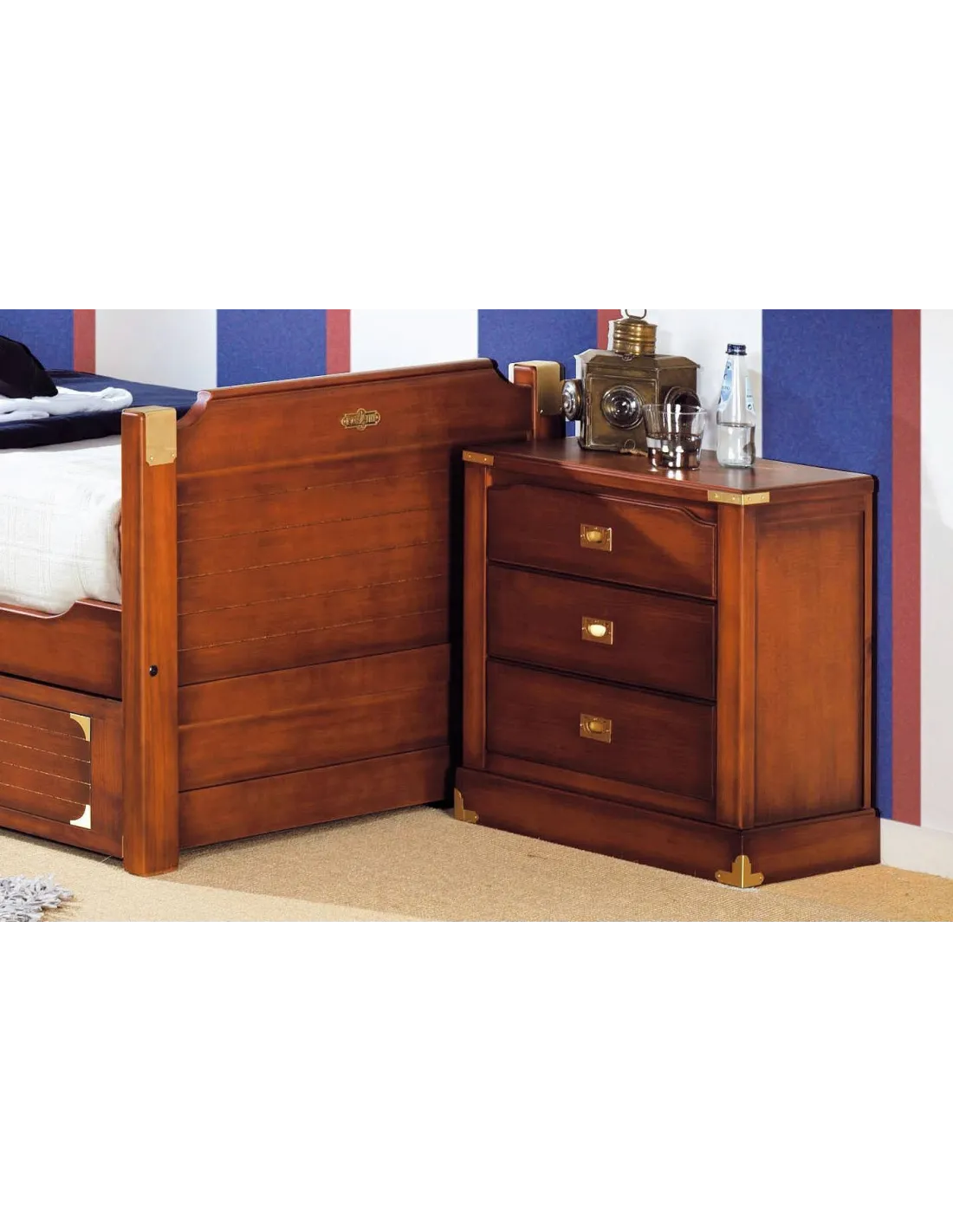 Esta mesita de noche colonial tres cajones tiene unos acabados pulimentados y barnizados de primera calidad, con la posibilidad de elegir entre blanco decapado, nogal claro y nogal naútico, con los detalles del mueble y herrajes de latón pulido.