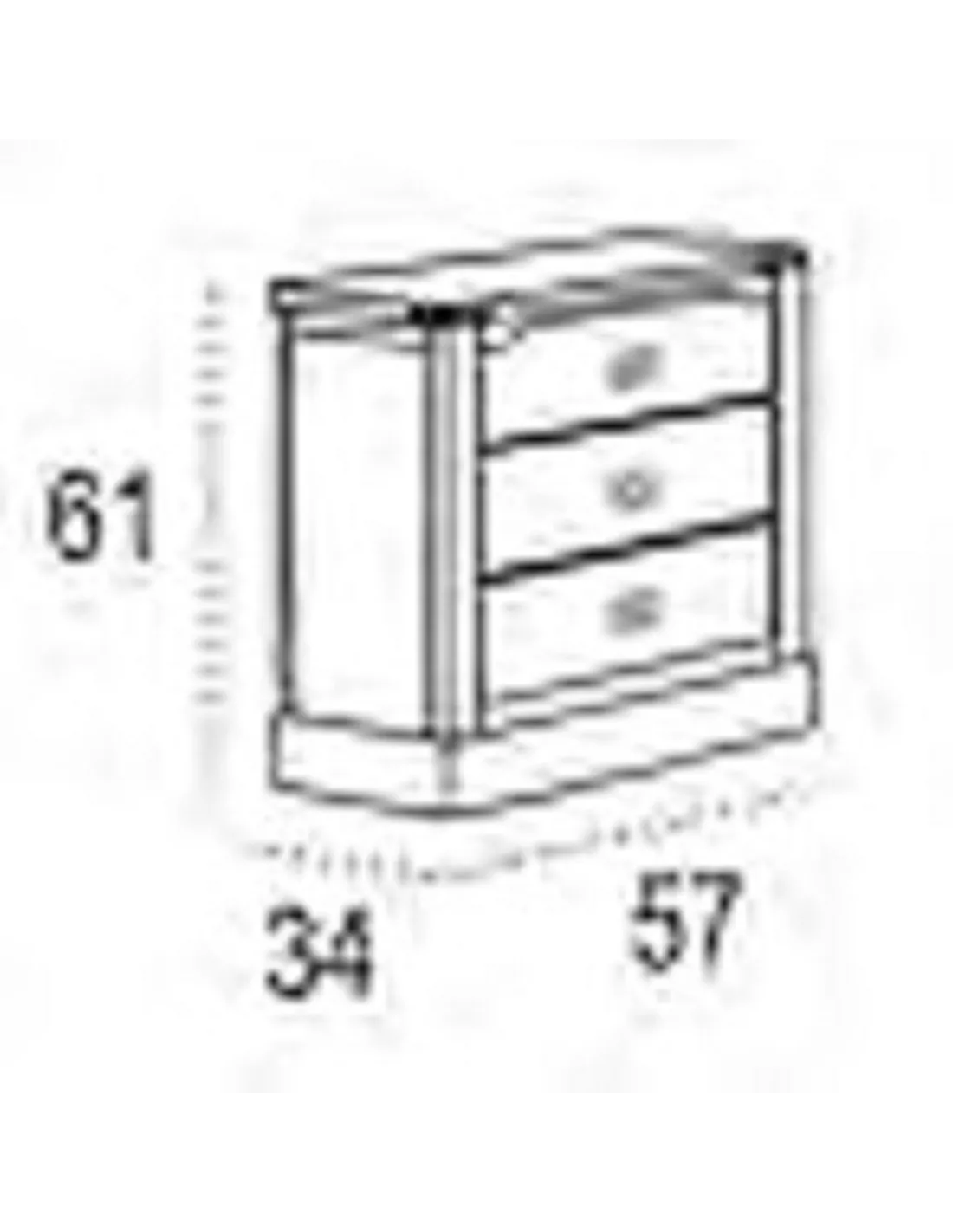 Esta mesita de noche colonial tres cajones está fabricada en madera de Fresno y tiene las siguientes medidas (largo x alto x fondo en cm.): 57 x 61 x 34