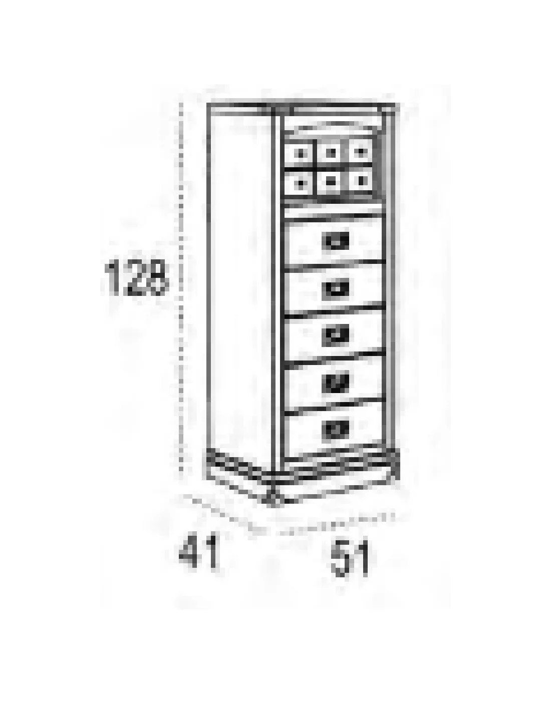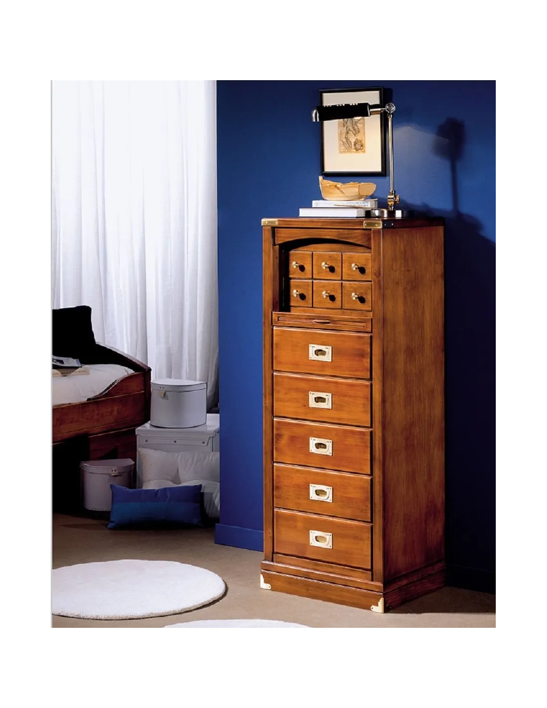 Este sinfonier colonial Camarote está fabricado en madera de Fresno. Viene terminado con 5 cajones y 2 de secreter (simulan ser 6), además de una bandeja extraíble. Tiene las siguientes medidas (largo x alto x fondo en cm.): 51 x 128 x 41