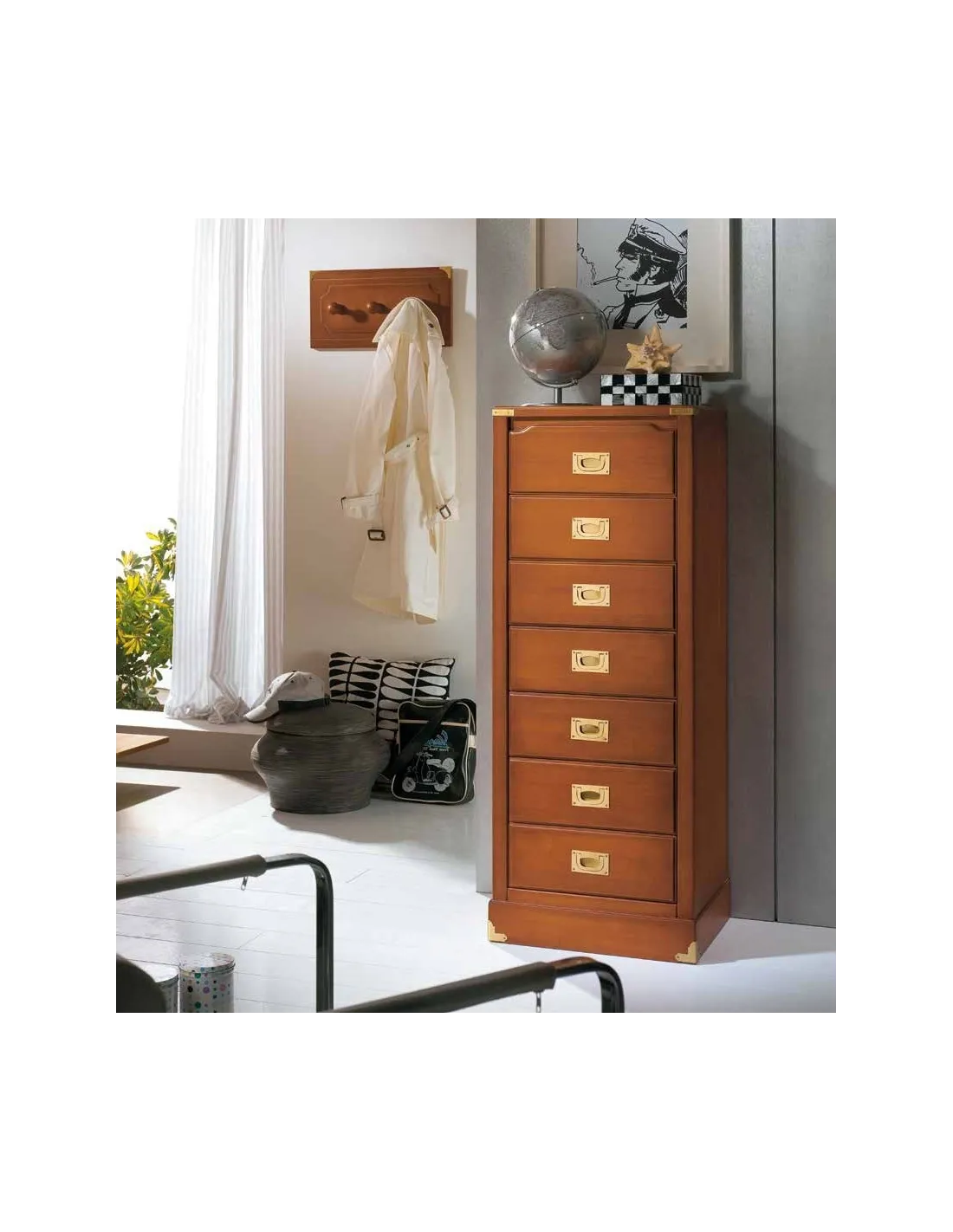 Este sinfonier colonial Camarote está fabricado en madera de Fresno. Viene terminado con 7 cajones de gran capacidad y tiene las siguientes medidas (largo x alto x fondo en cm.): 51 x 128 x 41