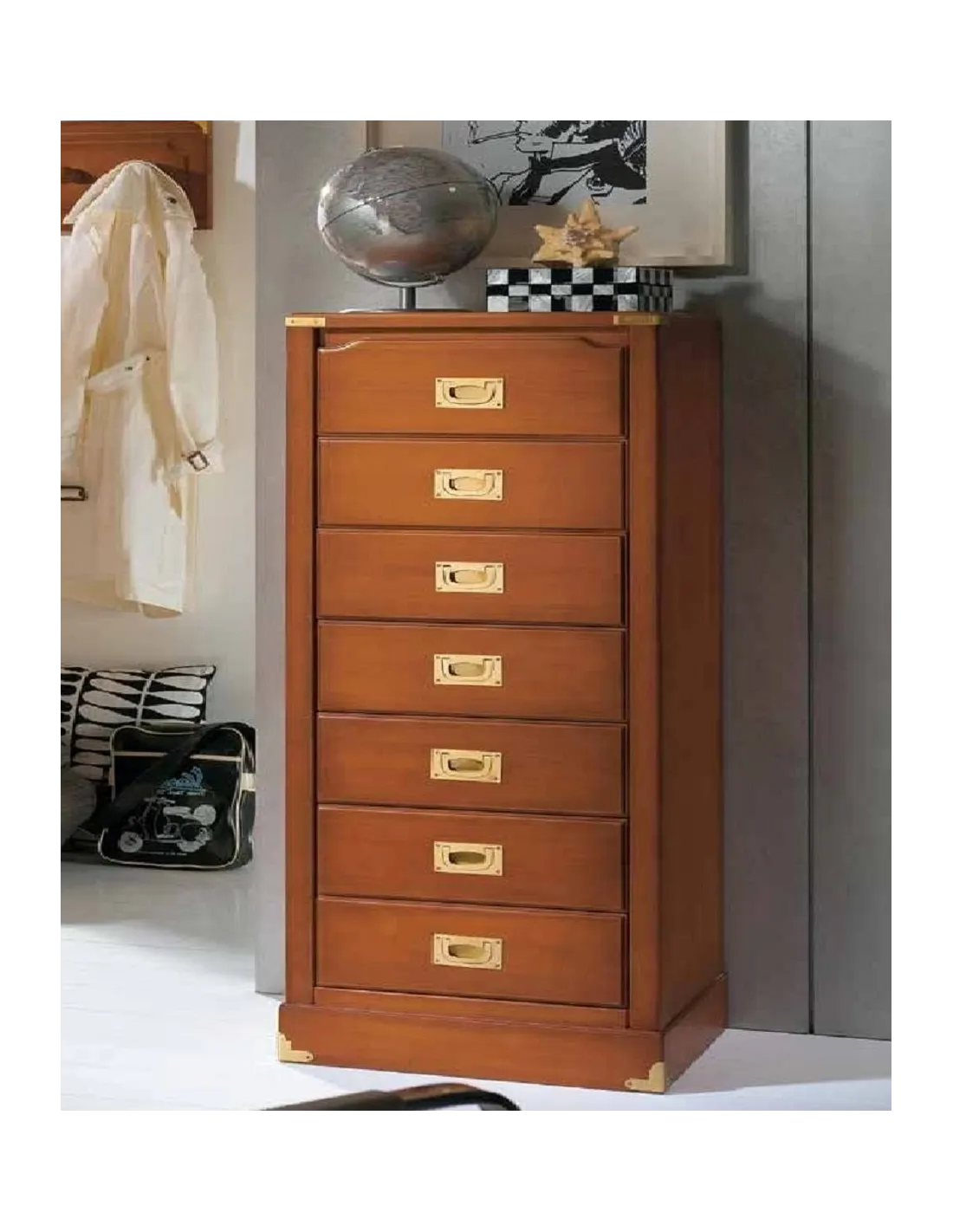 Esta sinfonier 7 cajones colonial tiene unos acabados pulimentados y barnizados de primera calidad, con la posibilidad de elegir entre blanco decapado, nogal claro y nogal naútico, con los detalles del mueble y herrajes de latón pulido.