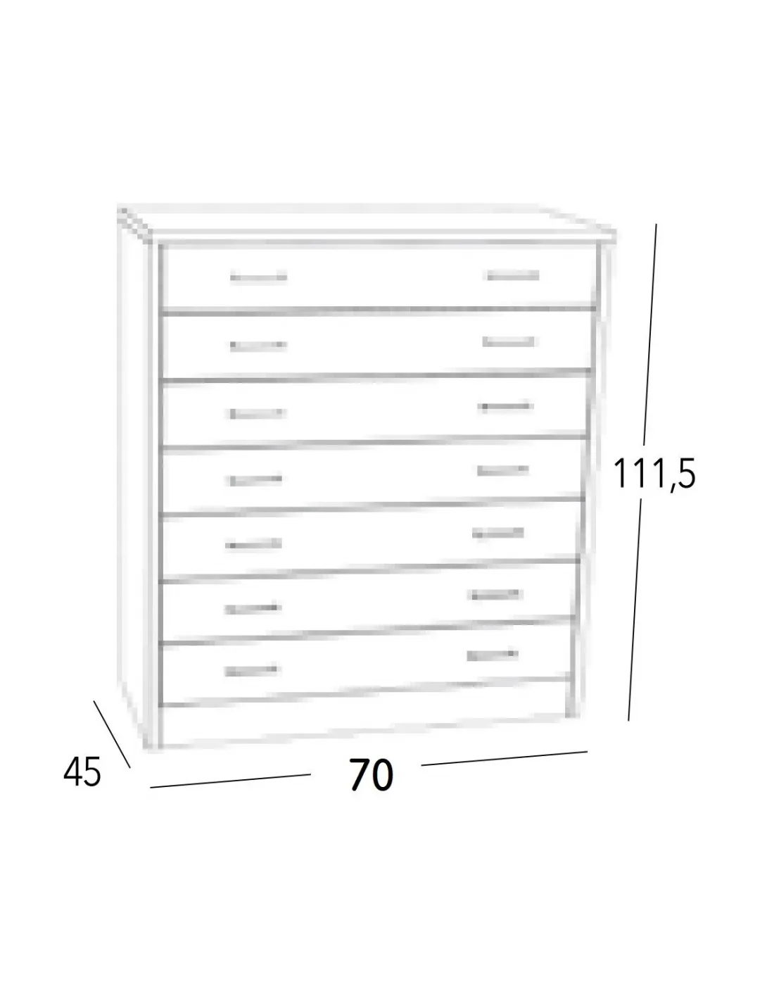 El sinfonier Nova madera maciza 7C está disponible con siete cajones de guía metálica de deslizamiento suave con gran capacidad de almacenaje y tiradores a elegir. Presenta las siguientes medidas totales en cm.: