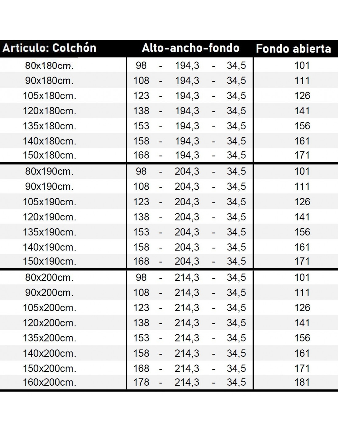 - Altura: 98 / 108 / 123 / 138 / 153 / 158 / 168 / 178 cm. (para colchones de ancho 80 / 90 / 105 / 120 / 135 / 140 / 150 / 160 cm. respectivamente)