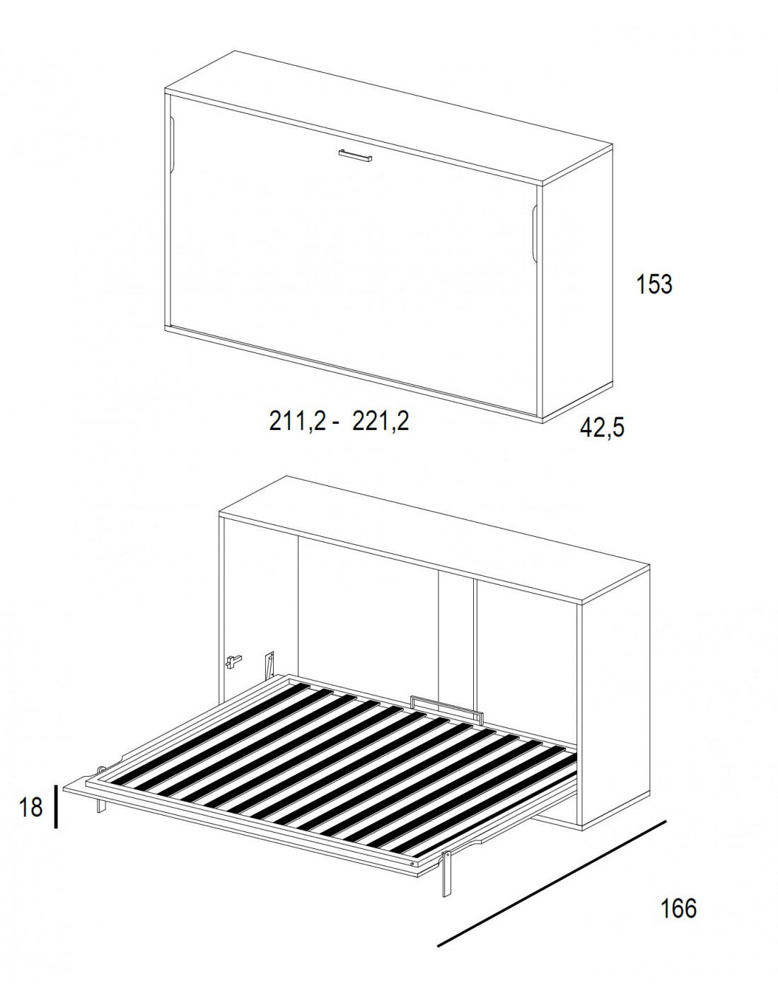 Esta cama abatible horizontal WT para colchón de 135 sencilla está disponible para colchones de 135x190 o 135x200 con hasta 27 cm. de altura. Tiene siguientes medidas totales en largo x alto x fondo (en cm.):