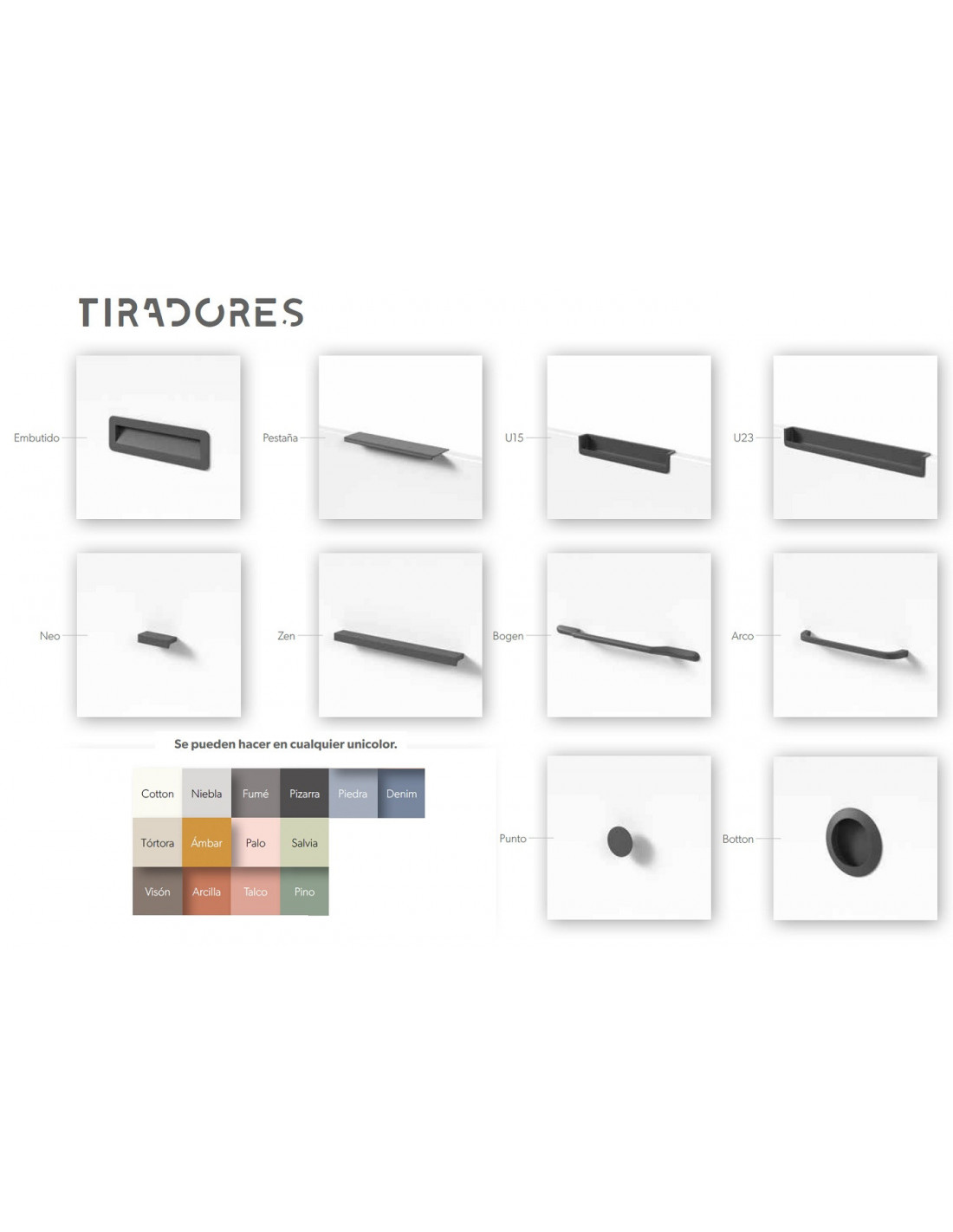 - Colores tiradores: a elegir entre los colores lisos, ya sean base o combinación. Se envía por defecto el mismo que en la foto principal.