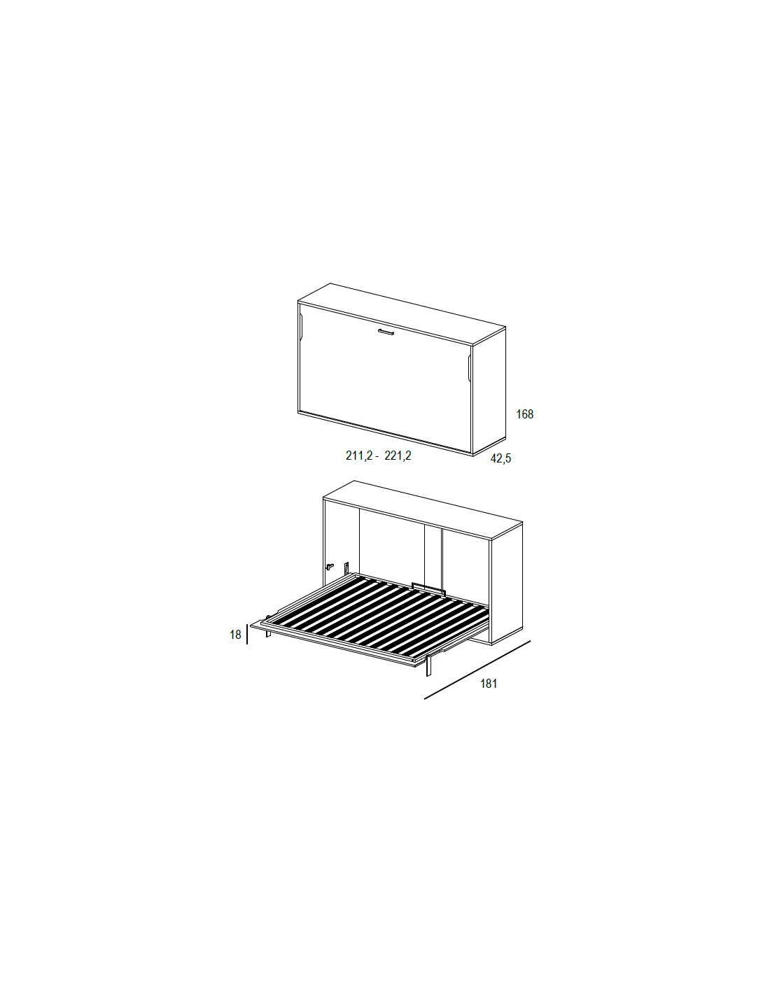 Esta cama abatible horizontal WT 150 sencilla está disponible para colchones de 150x190 o 150x200 cm. y 27 cm. de altura máxima. Tiene siguientes medidas totales en largo x alto x fondo (en cm.):