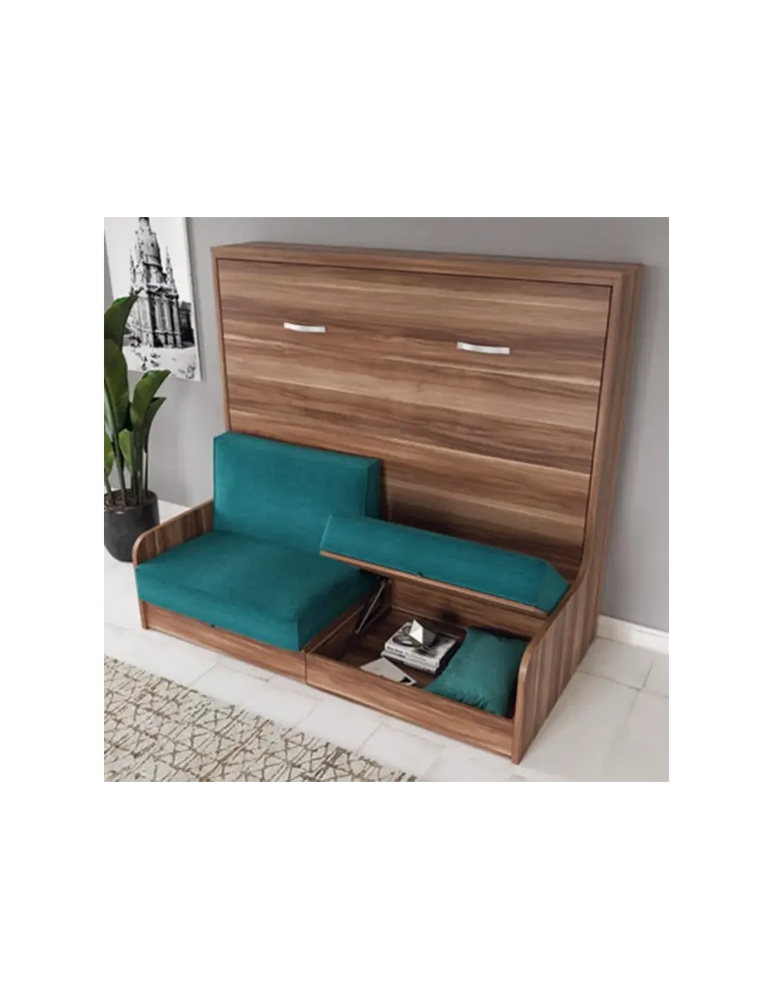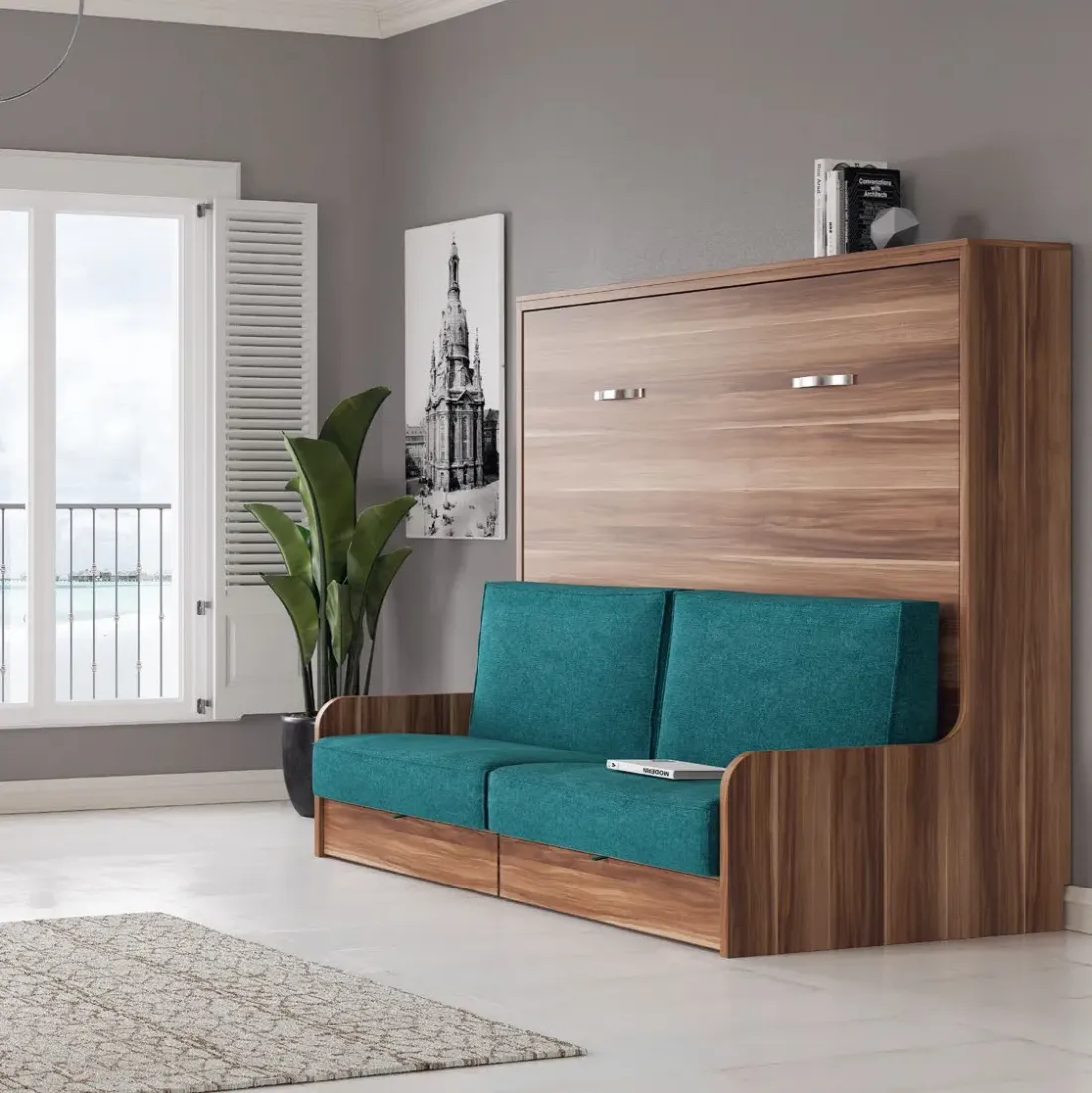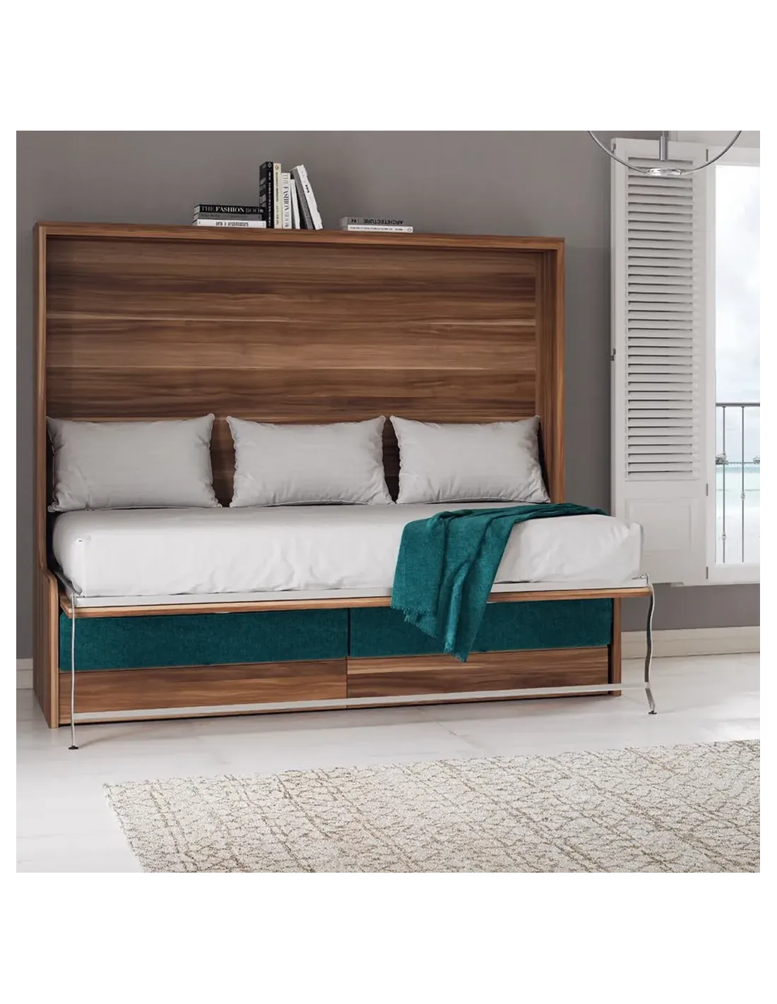 Cama abatible horizontal con sofá, preparada para instalación en paredes de pladur, disponible en medidas de colchón de 105 a 160 cm. de ancho y largo de 180 a 200 cm.