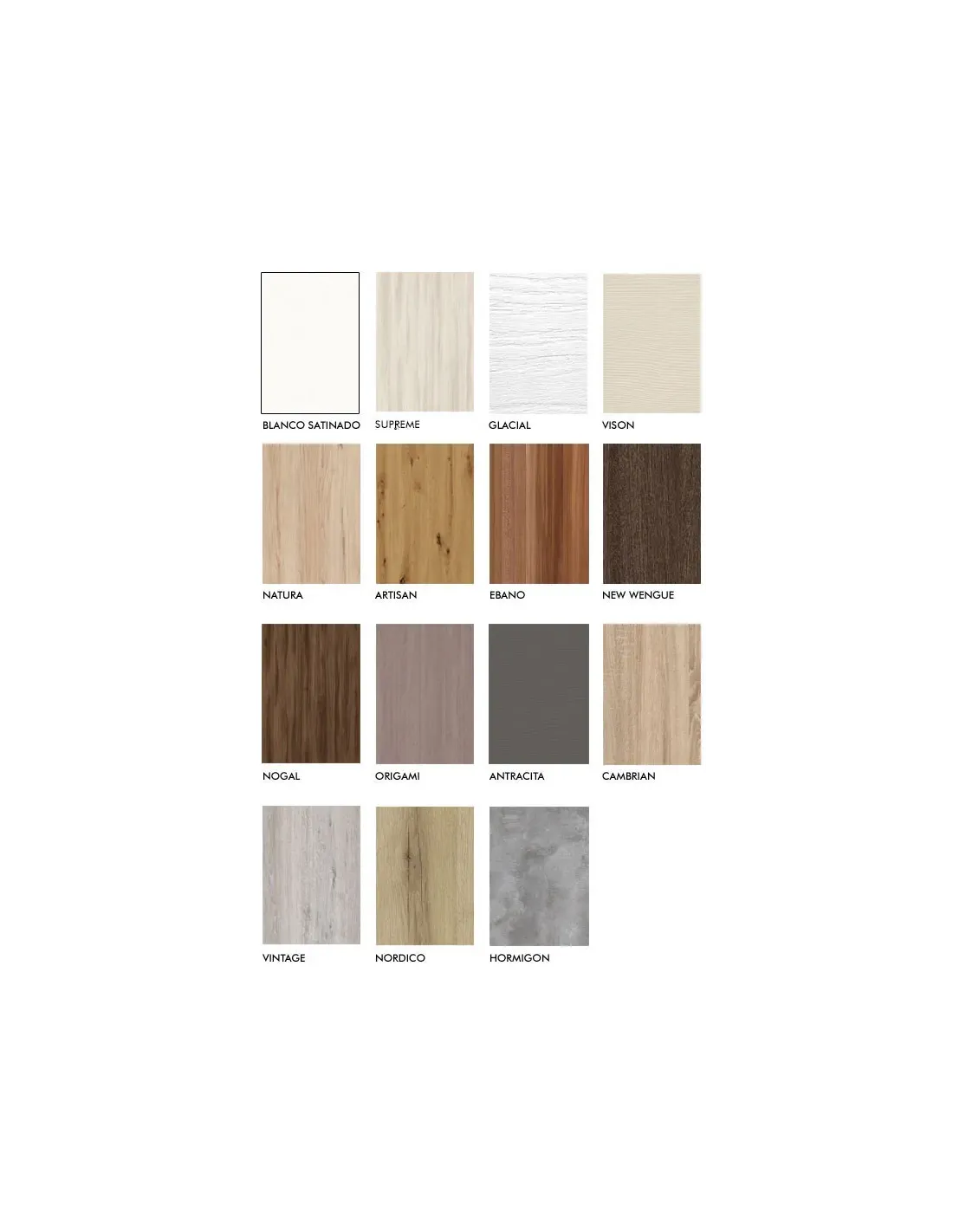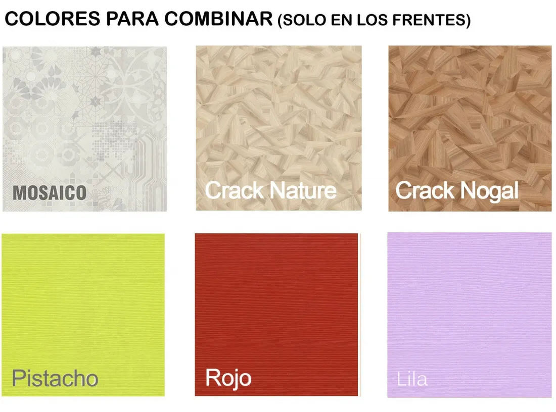 Estos dormitorios están disponibles en una serie de colores base, combinación así como una serie de tiradores a elegir para cada uno de los muebles. Se puede escoger colores para la estructura (casco), puerta y trasera interior de la siguiente manera: