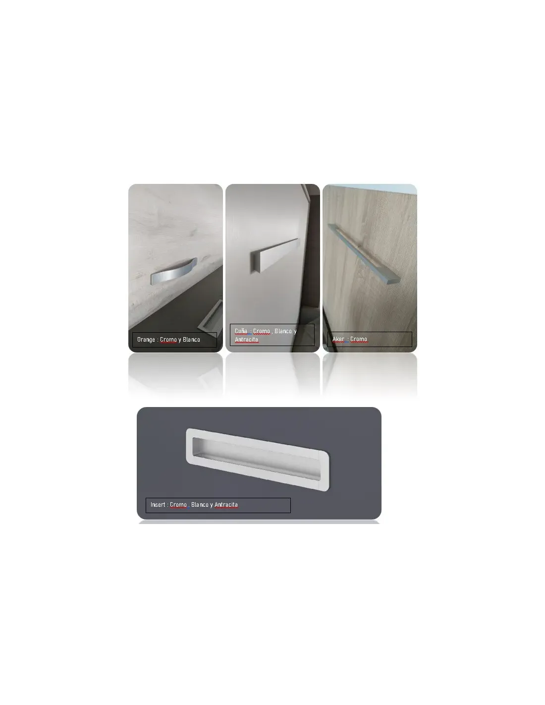 - Tiradores: por defecto se envía el modelo de asa metálica, recomendado por ser el que presenta mayor facilidad para la apertura. Se le puede poner cualquiera de los modelos disponibles en los colores indicados sin cargo.