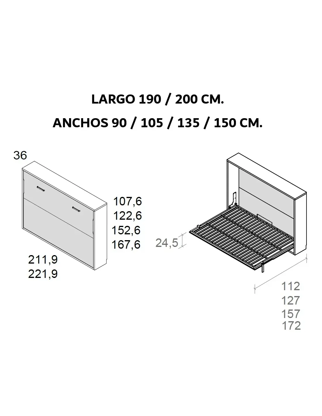 - Alto: la altura total de la cama abatible es de 152,6 cm.