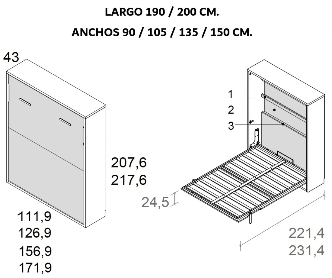 - Alto: la altura total de la cama abatible es de 207,6 / 217,6 cm. (para colchones de largo 190 / 200 cm.)
