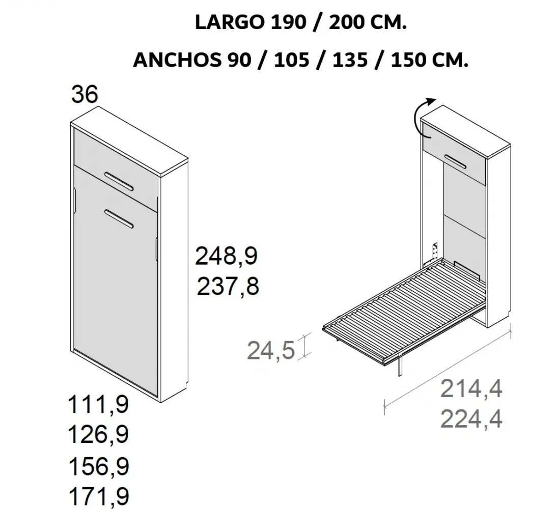- Alto: la altura total de la cama abatible es de 237,8 / 148,9 cm.