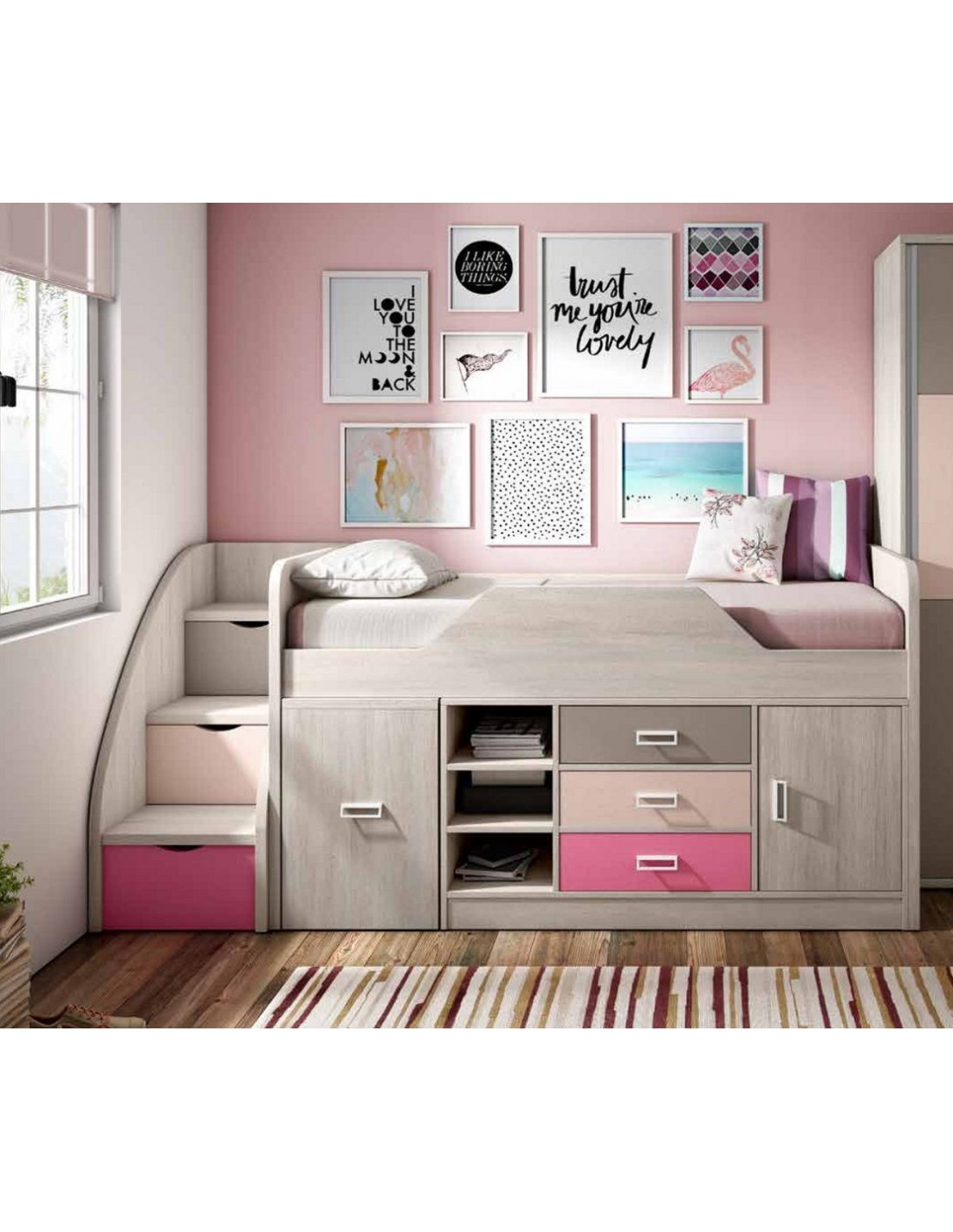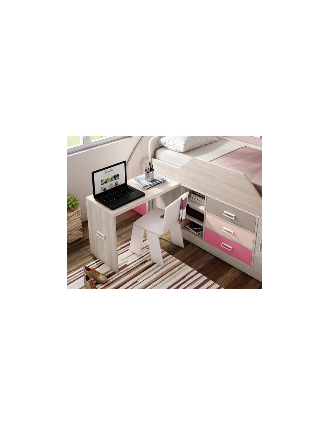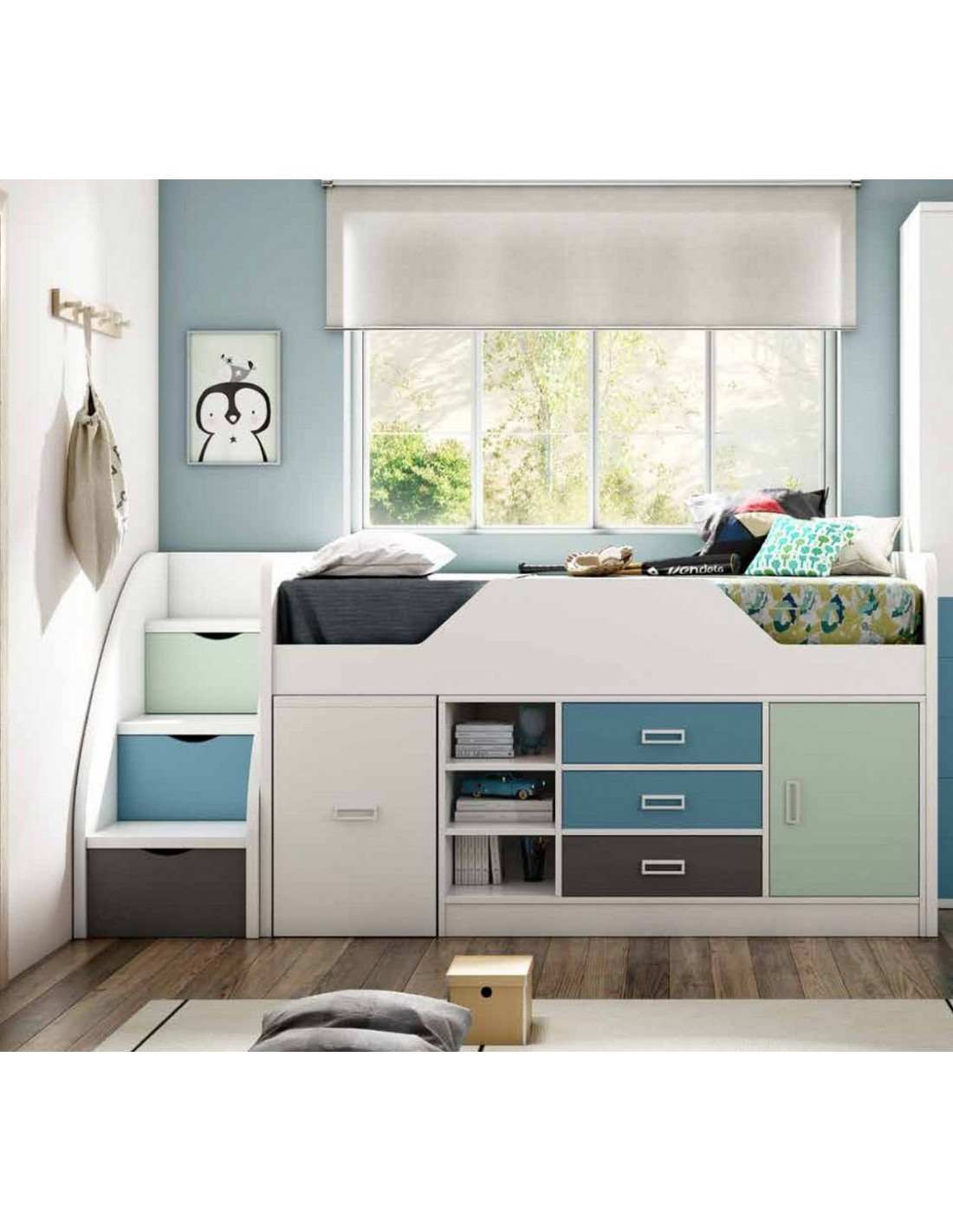 Este compacto con escritorio oculto incluye la escalera lateral de subida, con cajones y puertas, ideal para almacenar. Se puede colocar a derecha e izquierda. Incluye los soportes para la base del colchón, la trasera de la cama y tiene diez colores a elegir. Esta son las medidas: