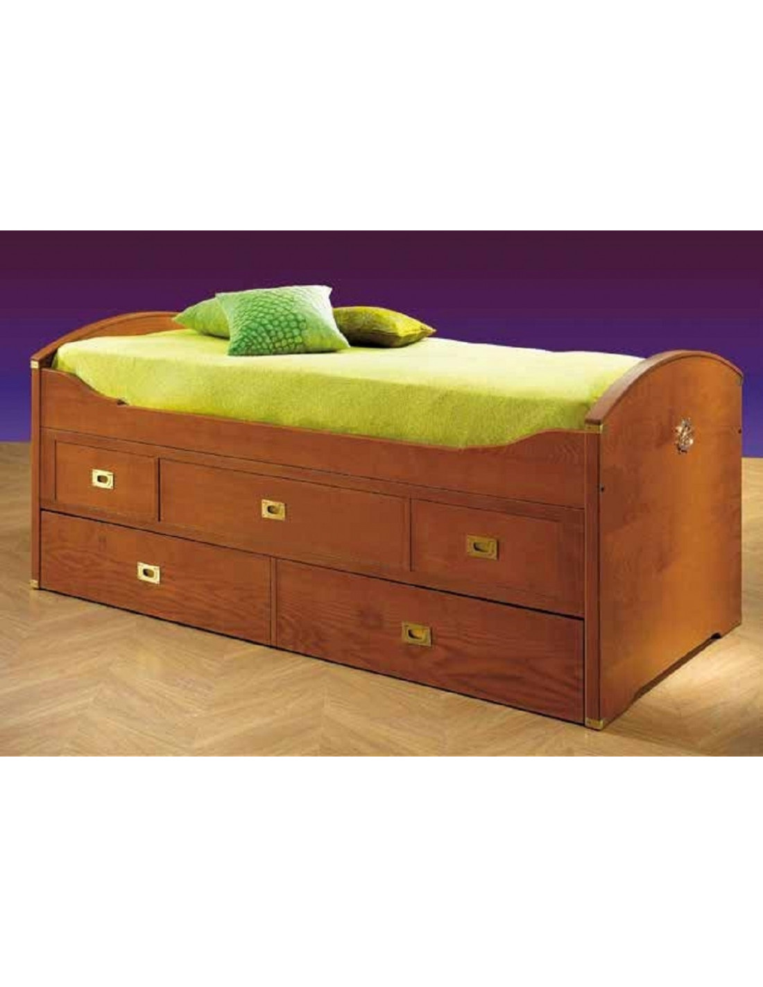 Esta cama de madera con cajones tiene unos acabados pulimentados y barnizados de primera calidad, con la posibilidad de elegir entre blanco decapado, nogal claro y nogal naútico, con los detalles del mueble y herrajes de latón pulido.