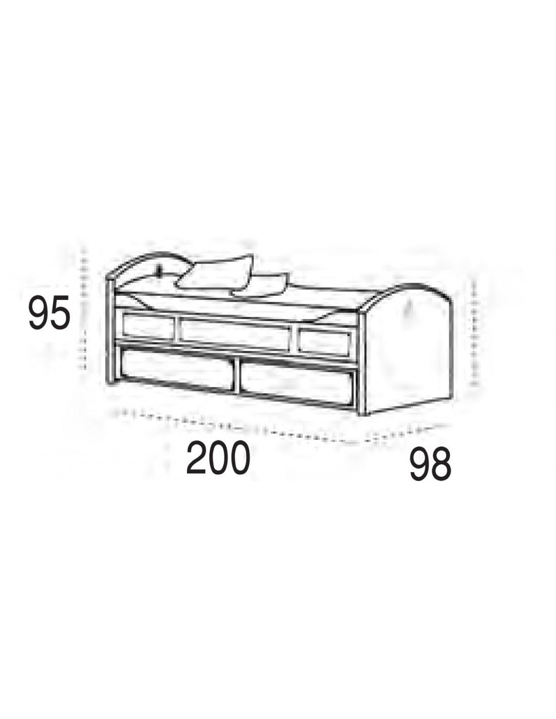 Esta cama con cajones fabricada en madera de Fresno viene preparada para colchón de hasta 90x190 cm. y tiene las siguientes medidas (largo x alto x fondo en cm.): 200 x 95 x 98