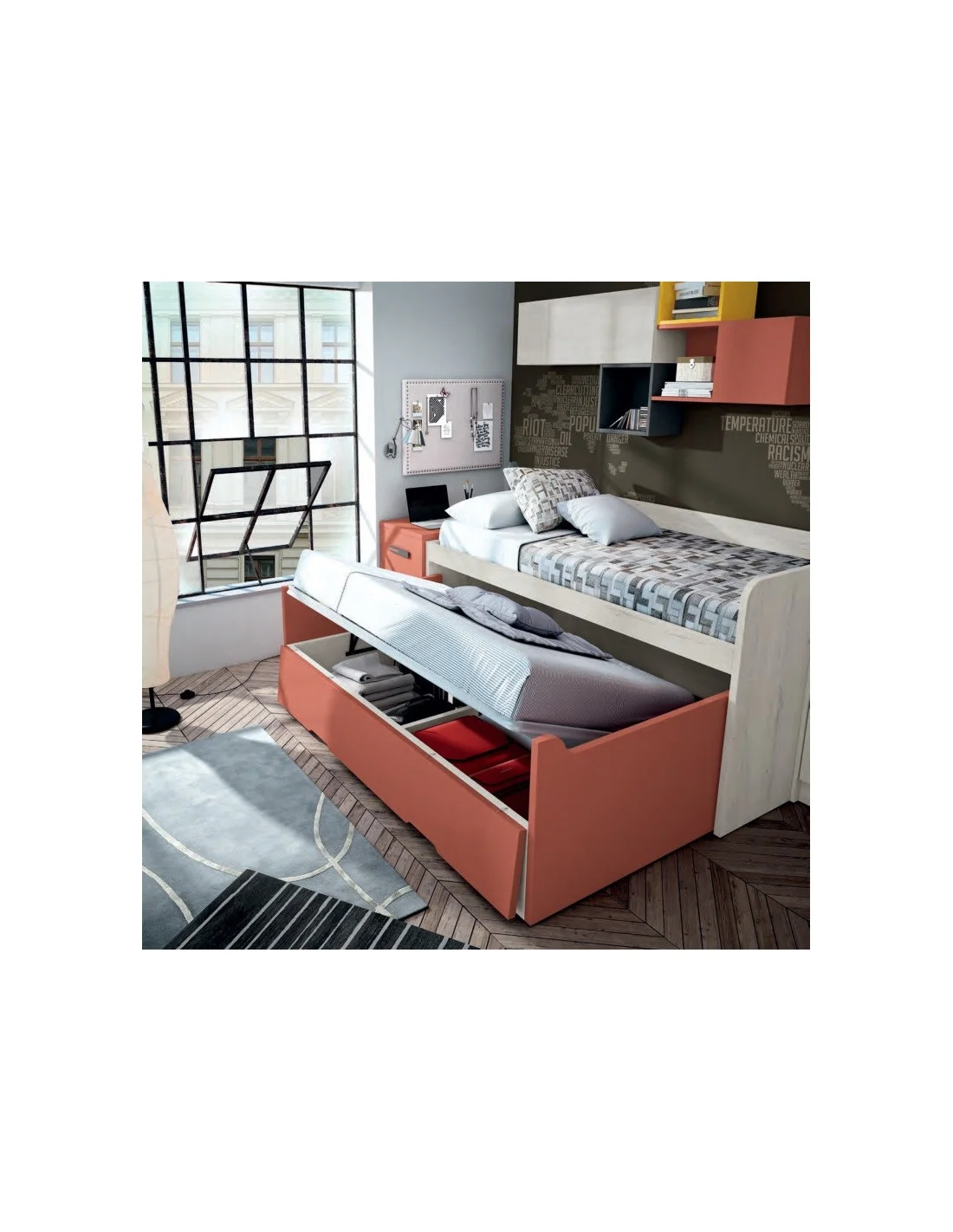 - DOS CAMAS, de 105x190 y de 105x180 cm. La superior es fija y la inferior es de frontal alto abatible, con ruedas para extraerla y canapé abatible en su parte inferior.