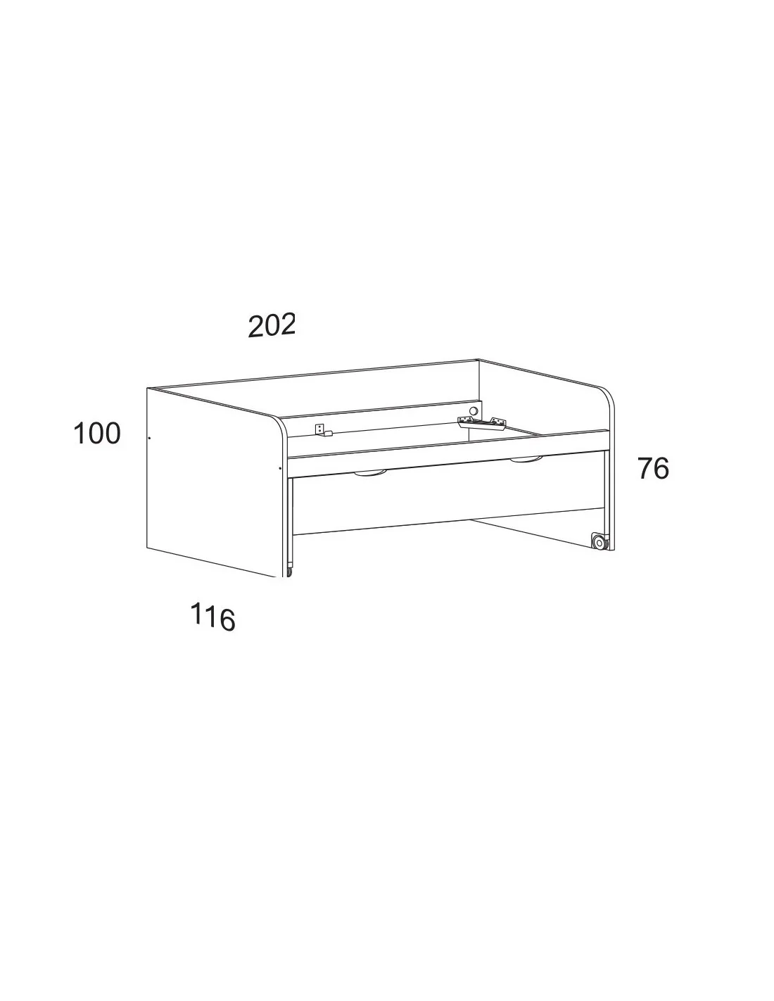 Aunque puede hacer con otras medidas, para esta cama compacta de dos colchones de 90x190 tenemos las siguientes medidas alto x largo x fondo: 100 x 202 x 116 cm.