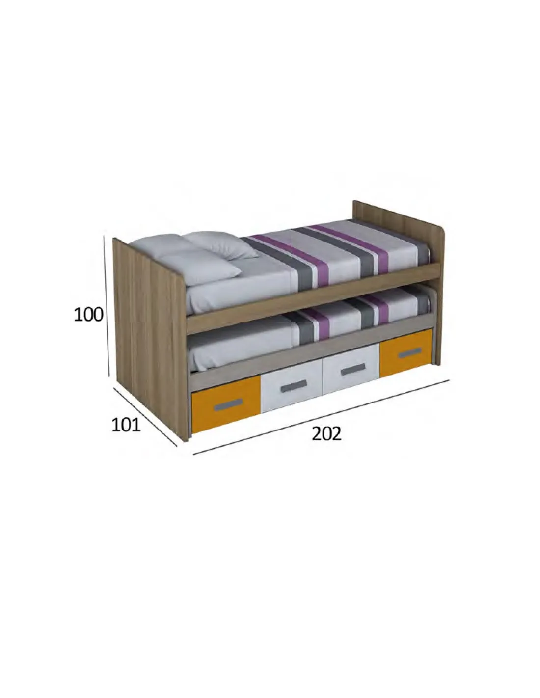 - DOS CAMAS, una de 90x190 y otra de 90x180 cm. La superior es fija y la inferior tiene ruedas y freno.