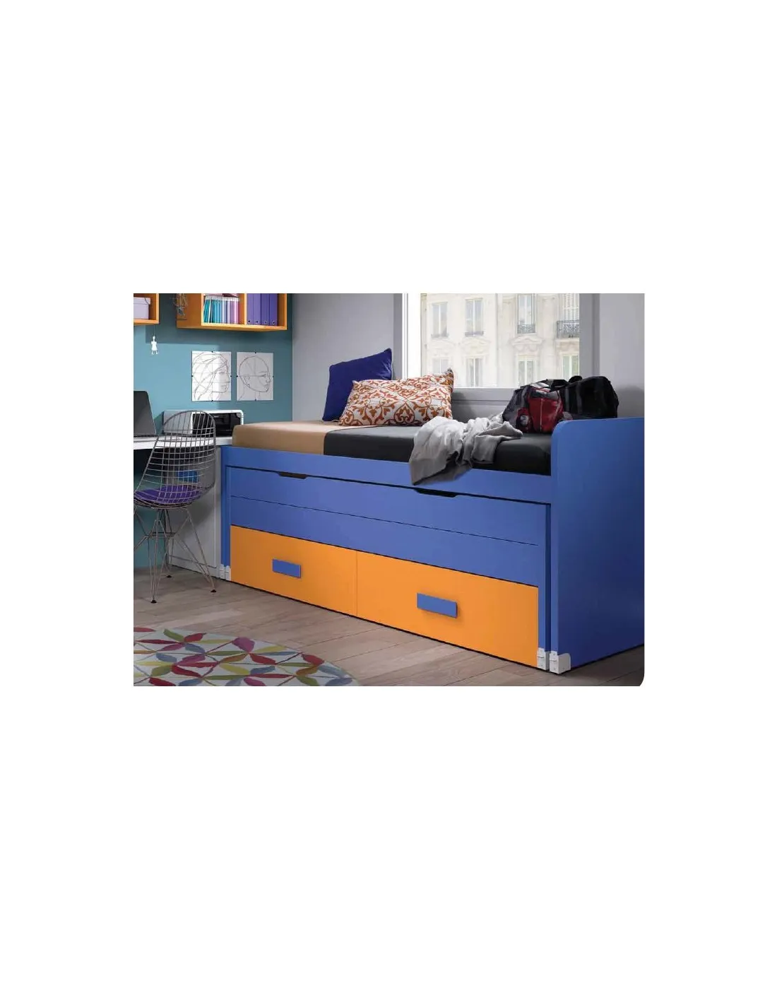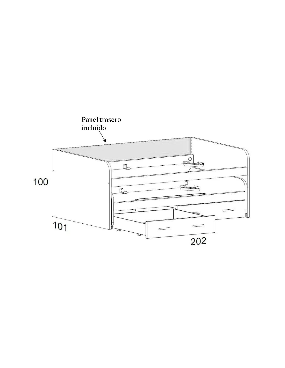 Cama compacta alta con cabezal recto de fabricación española hecha en melamina de primera calidad con tablero melamínico de primera calidad resistente a ralladuras y manchas, según normativa vigente. Tablero de 30 mm. de grosor canteado en PVC de 1 mm. de grosor y herrajes de primera calidad.
