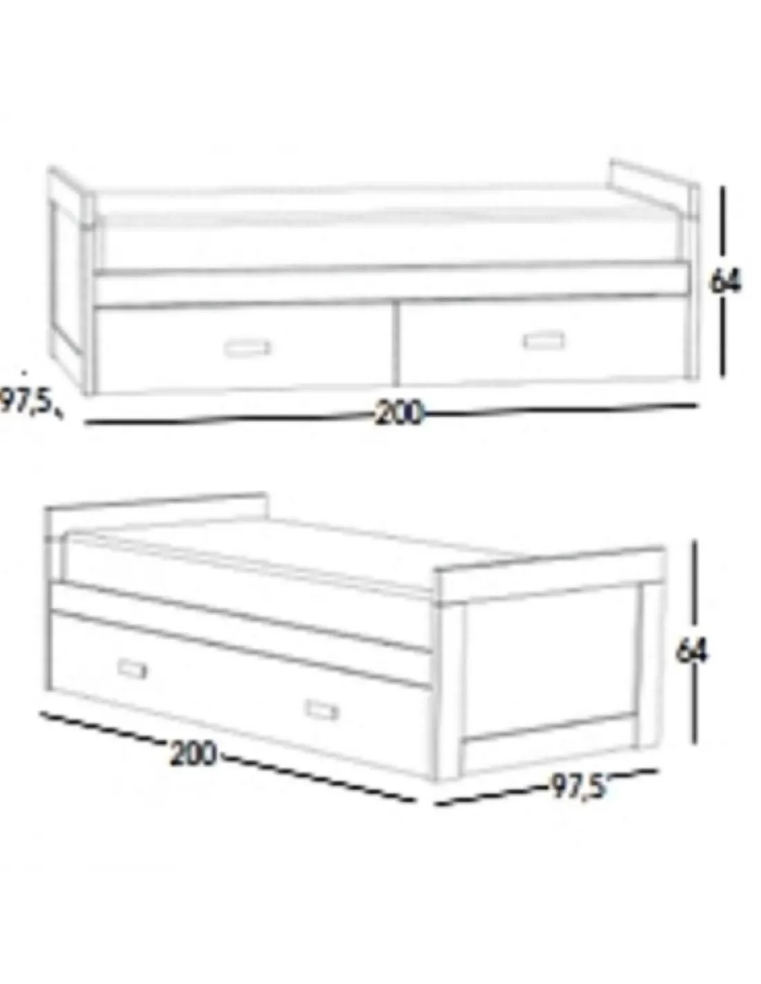 Esta cama nido Coral está disponible para colchones de 90 x 190 cm. con las siguientes medidas totales de la cama: