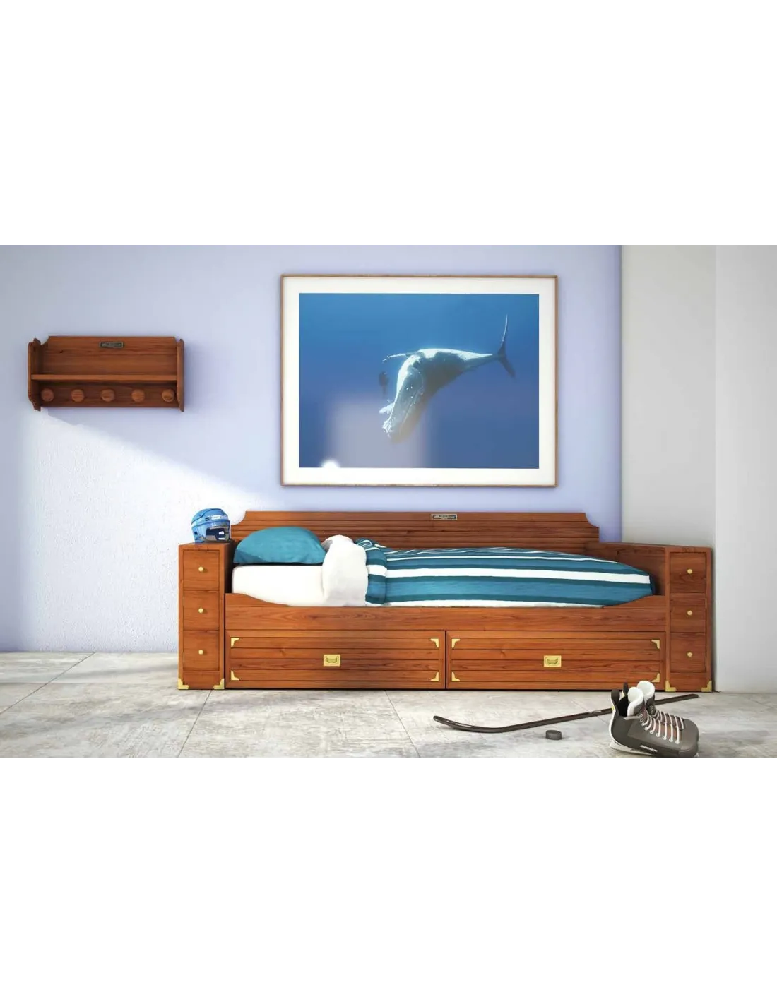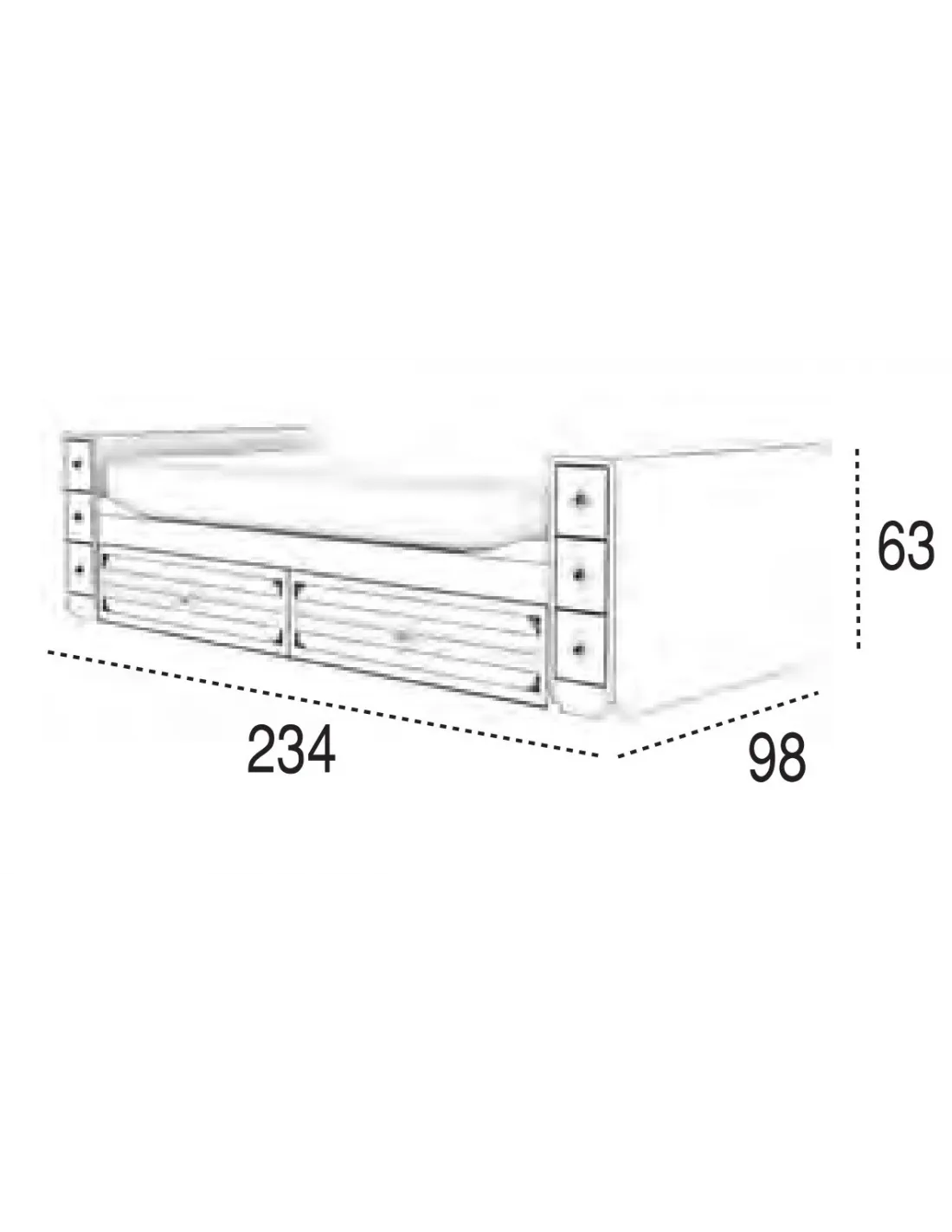Esta cama nido colonial con ocho cajones fabricada en madera de Fresno viene preparada para colchón de hasta 90x190 cm. y tiene las siguientes medidas (largo x alto x fondo en cm.): 234 x 63 x 98