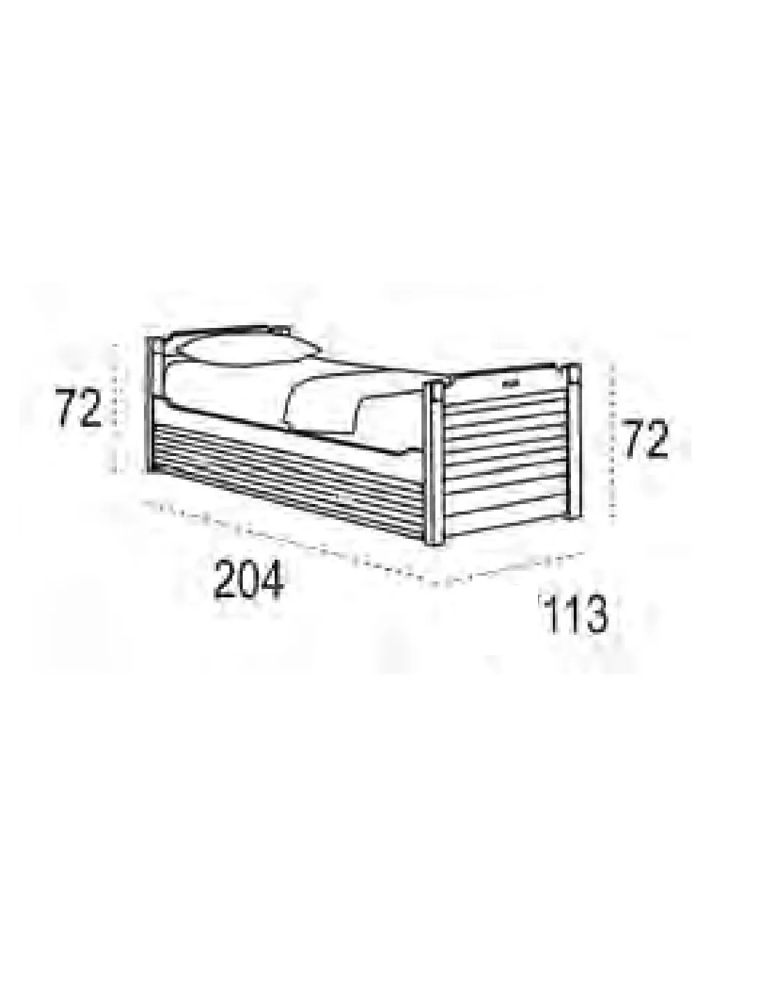 Esta cama 105 con cajones de gran capacidad fabricada en madera de Fresno viene preparada para colchón de hasta 90x190 cm. y tiene las siguientes medidas (largo x alto x fondo en cm.): 204 x 72 x 113