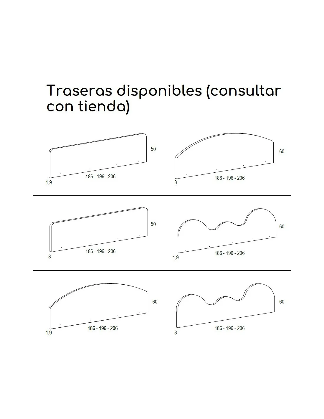 - Cama: 192 / 202 / 212 (colchón 180 / 190 / 200) x 90 / 100 / 115 (colchón 80 / 90 / 105) x 65 (altura base cama superior 40 cm. aproximadamente)