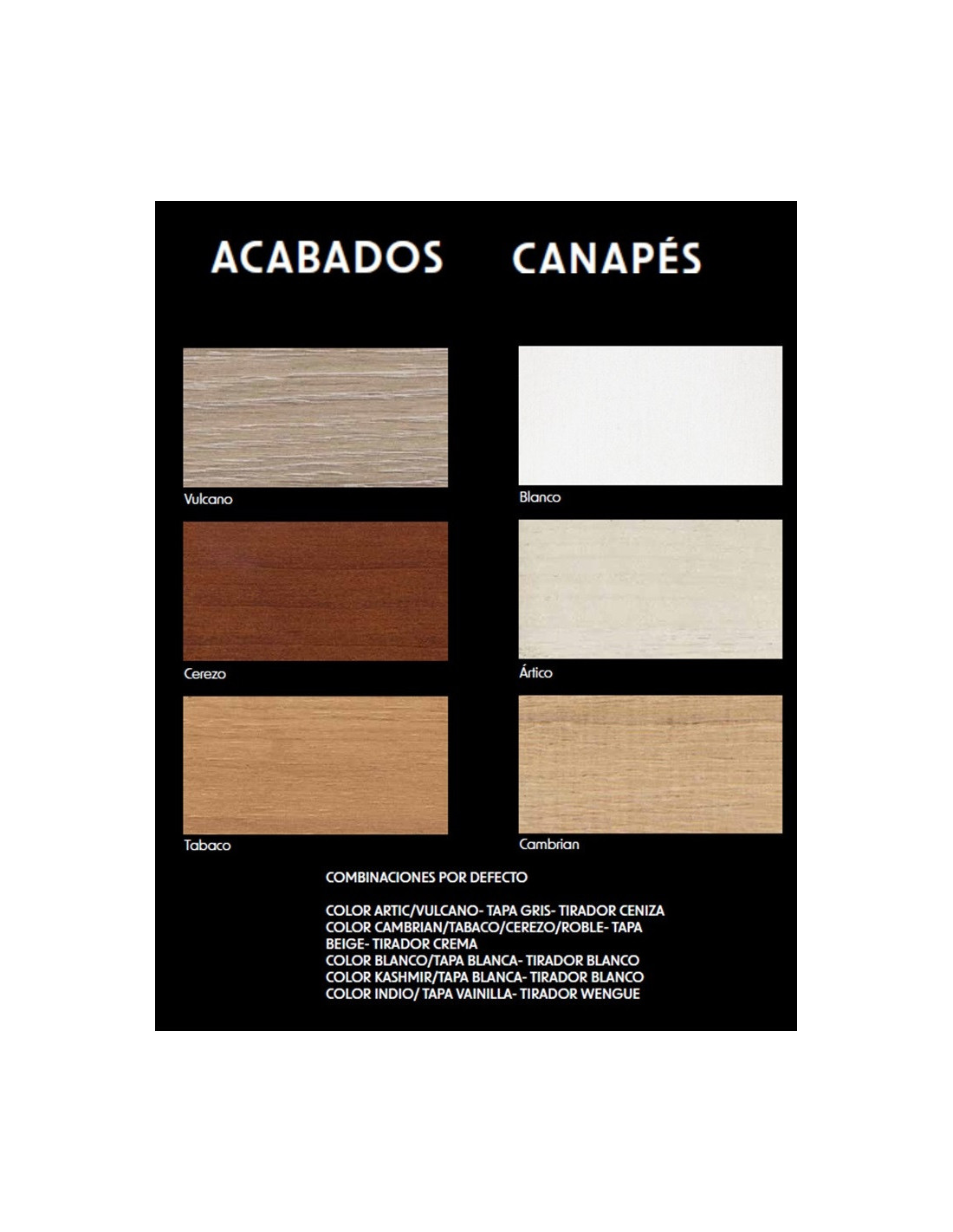 Este canapé eléctrico articulado con dos cuerpos está disponible en seis colores de madera para el cajón (Ártico, blanco, cambrian, cerezo, tabaco y vulcano), con la base y el tirador a juego, cuenta con cuatro patas de madera maciza de haya extragruesas y largueros de grosor 30 mm.