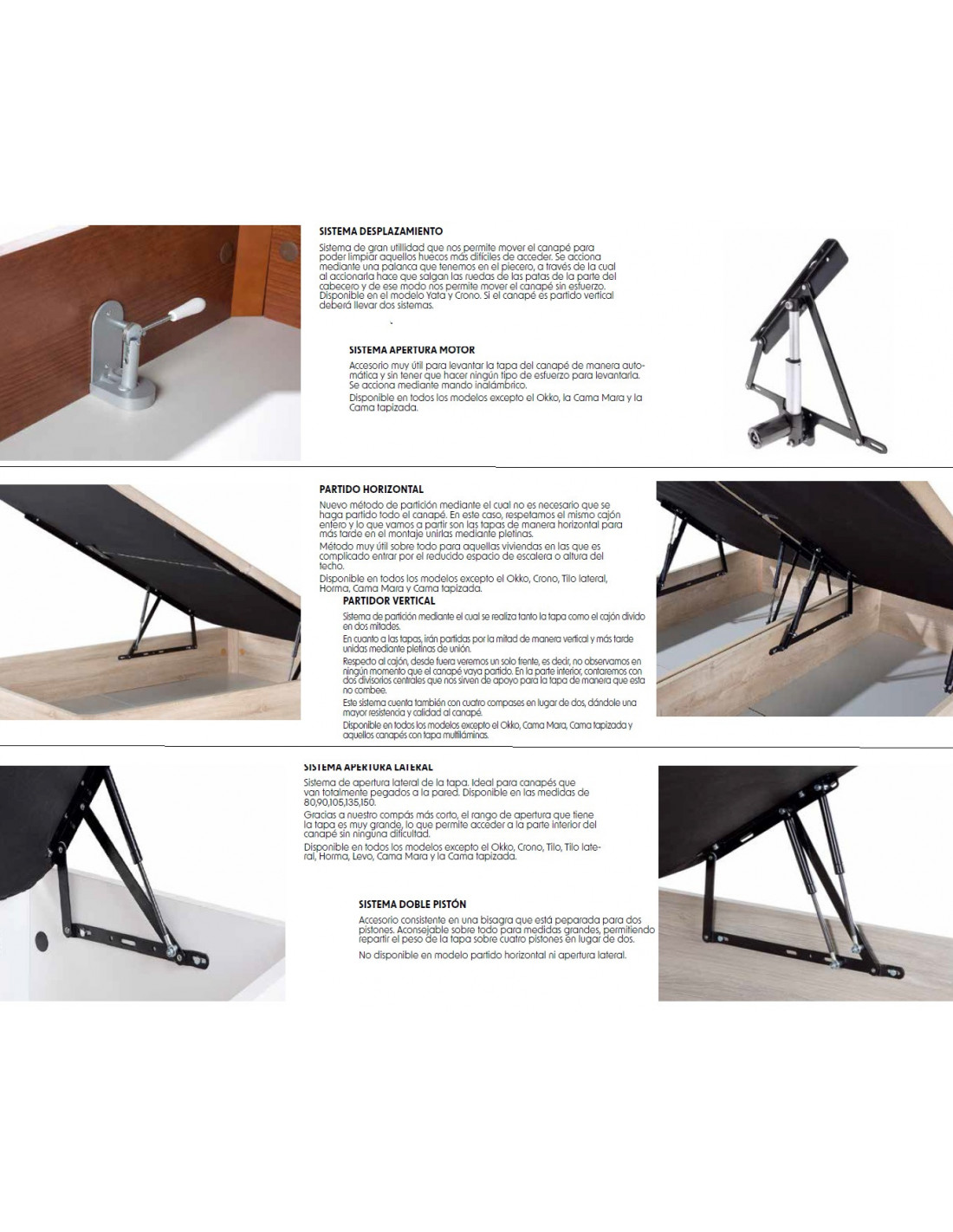 Este canapé abatible articulado eléctrico, además de su personalización en colores, viene preparado para incorporar el sistema de apertura por motor, en el que un brazo hidraúlico conectado a la red eléctrica nos abre el canapé con simplemente accionar un botón del mando inalámbrico. Resumen de las variantes disponibles para estos canapés: