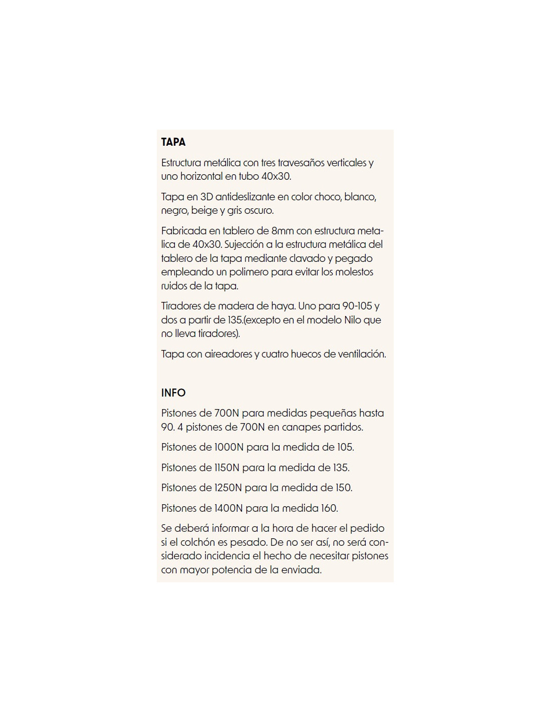 2. Se puede reducir la altura del canapé restando capacidad, con su correspondiente incremento en el precio.