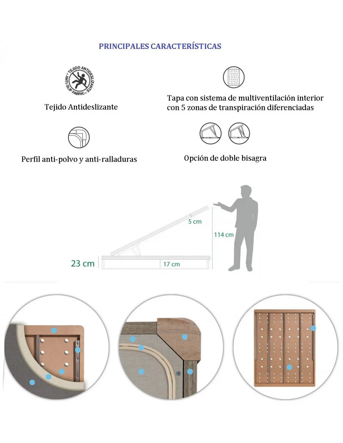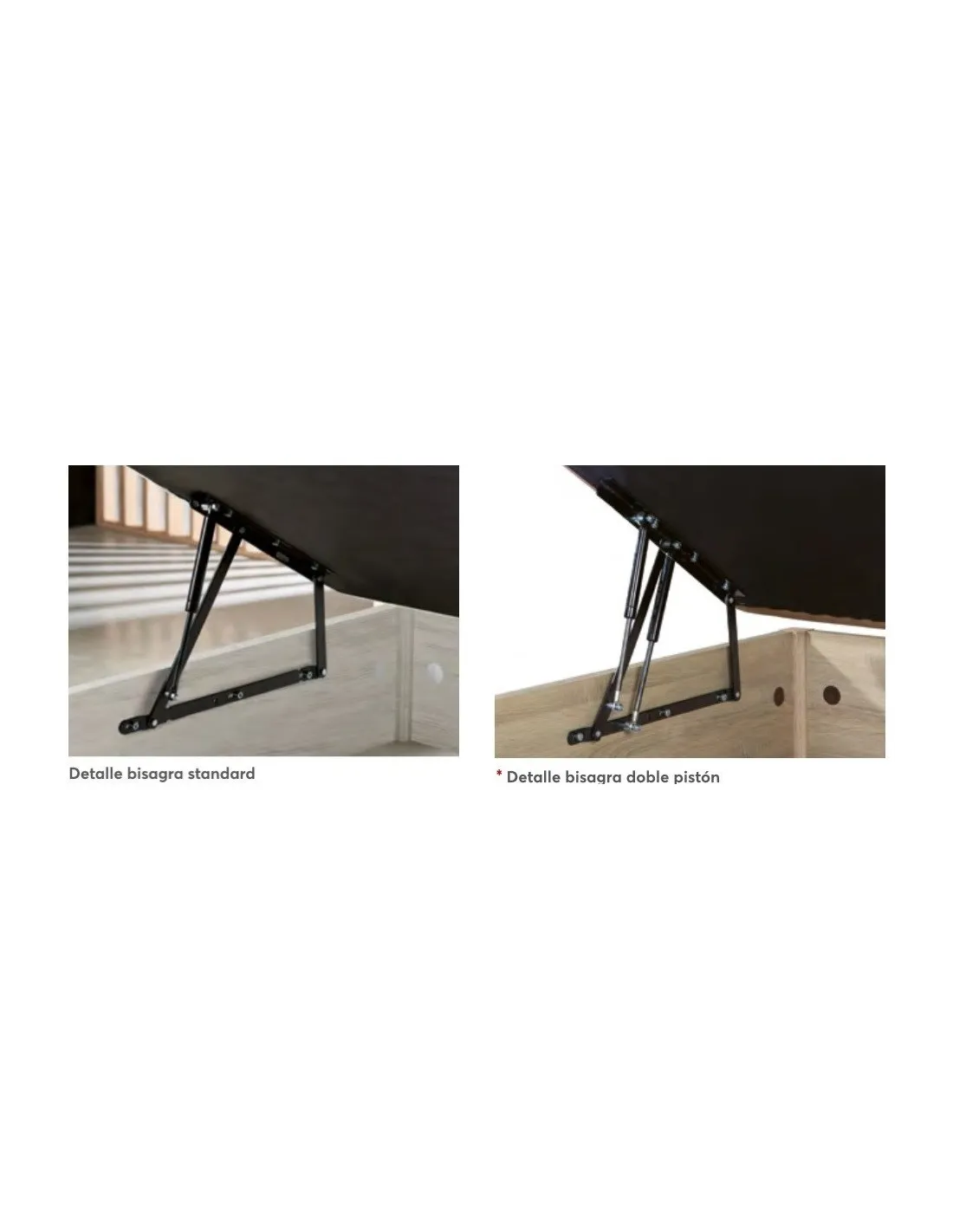 El somier metálico de soporte cuenta con refuerzos transversales y longitudinales además del arco metálico. Estos refuerzos evitan deformaciones de la tapa con lo que conseguimos un canapé más duradera. Además, vienen acabadas con tiradores de madera maciza a juego con el resto del canapé.