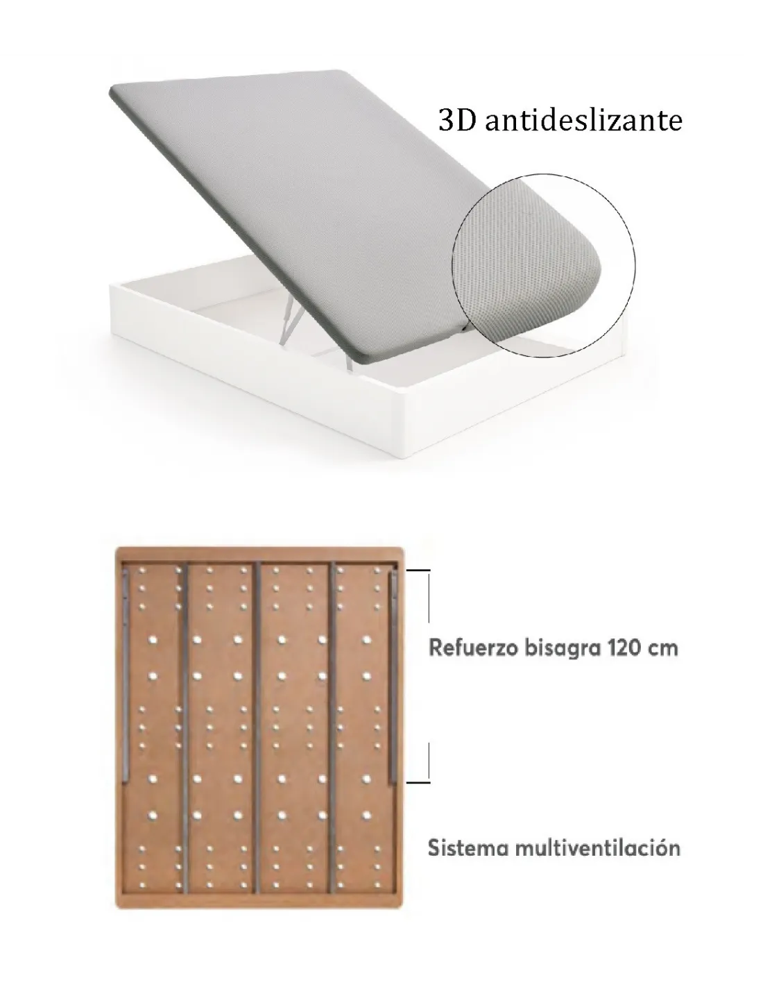 ¿Esta preparado para soportar peso? la respuesta, definitivamente, es si. El fondo del canapé tiene un espesor de 12mm. y va sujetado al contorno con 26 tornillos en medida de 150x190. Además cuenta con goma antipolvo en el suelo.