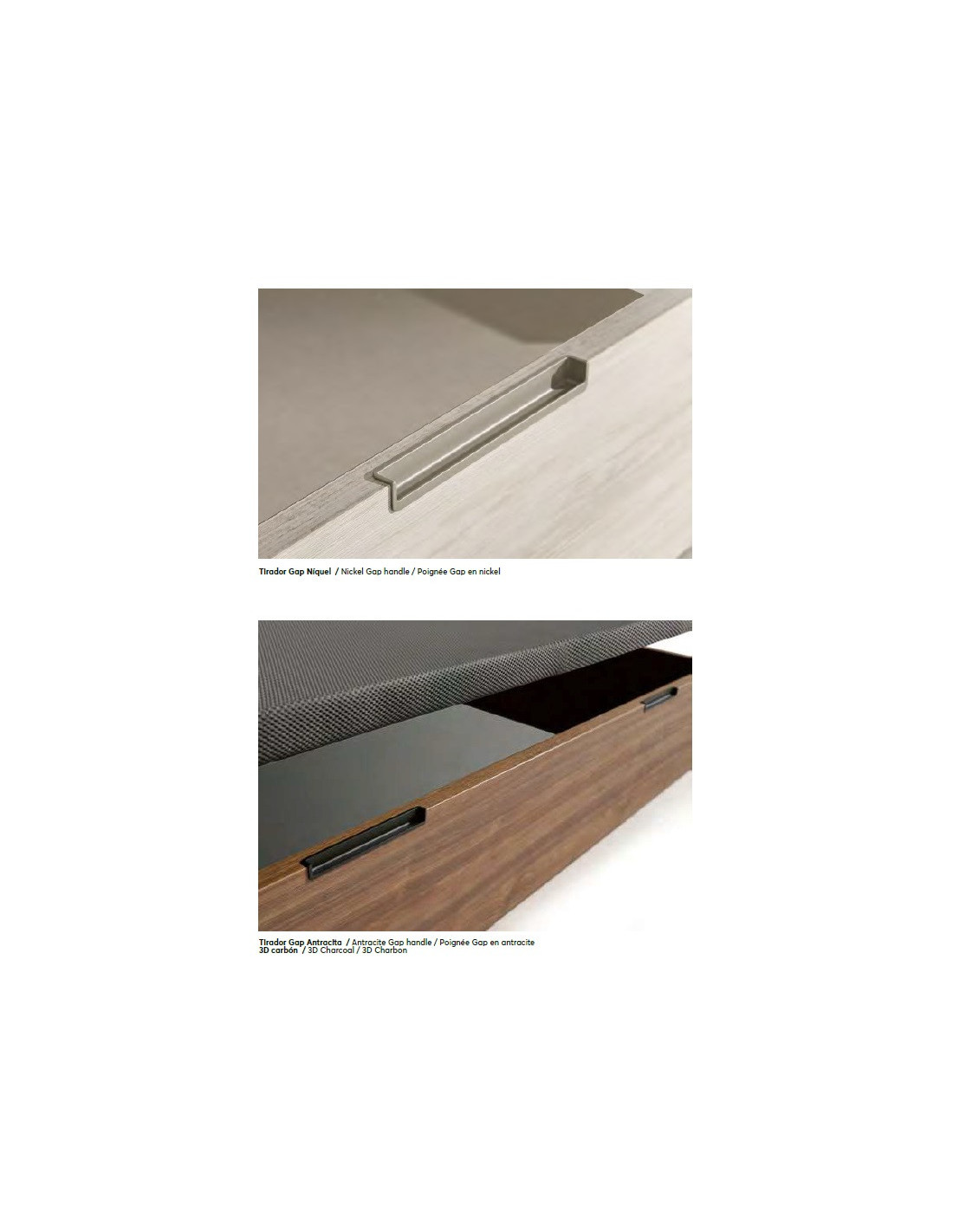 Además puedes optar por ponerle diferentes tiradores: los de madera a juego con el resto del canapé o el tirador uñero GAP (antracita o níquel) que queda embutido bajo el canapé sin sobresalir.